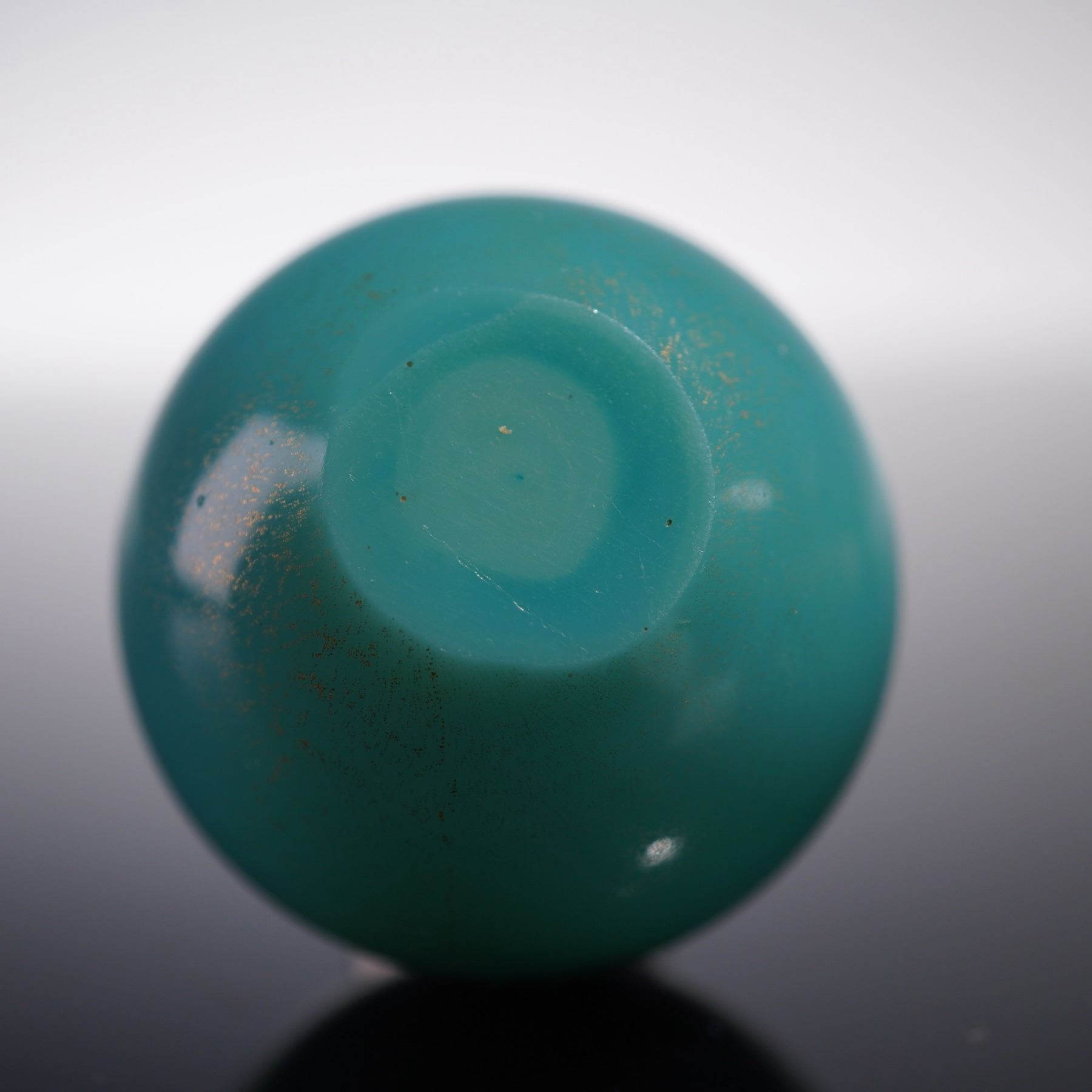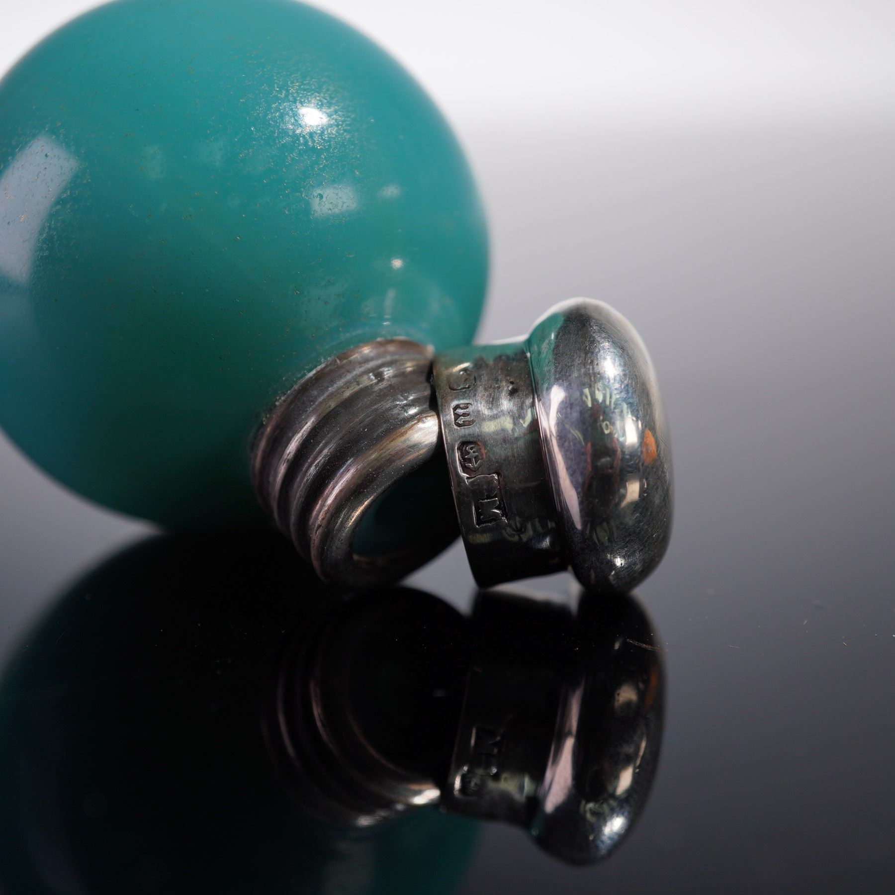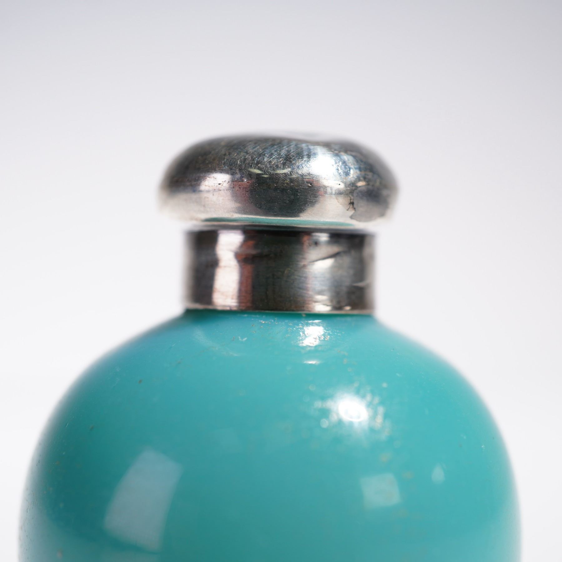 This exquisite English scent bottle, adorned with silverplate and metal mounts, showcases the refined artistry of the late 19th to early 20th century. Crafted from delicate turquoise opaline glass, it features subtle detailing that highlights the period's craftsmanship and elegance. Both practical and decorative, this piece served as a symbol of sophistication and personal style in its time.