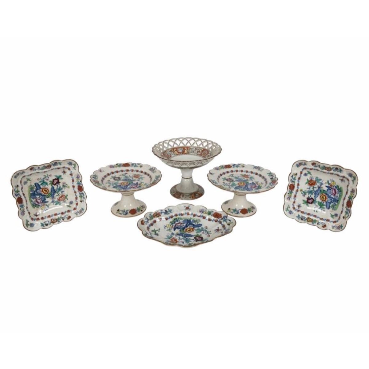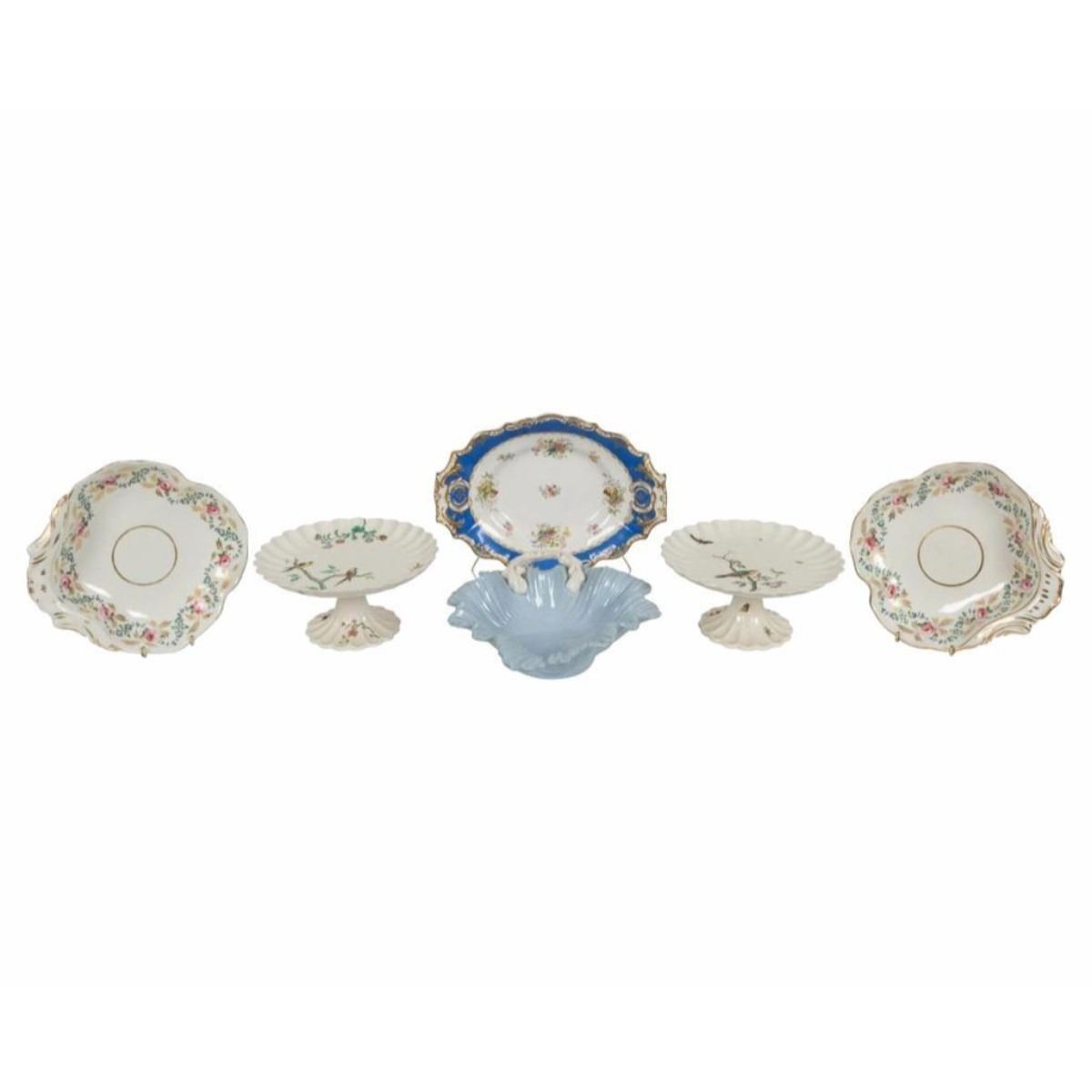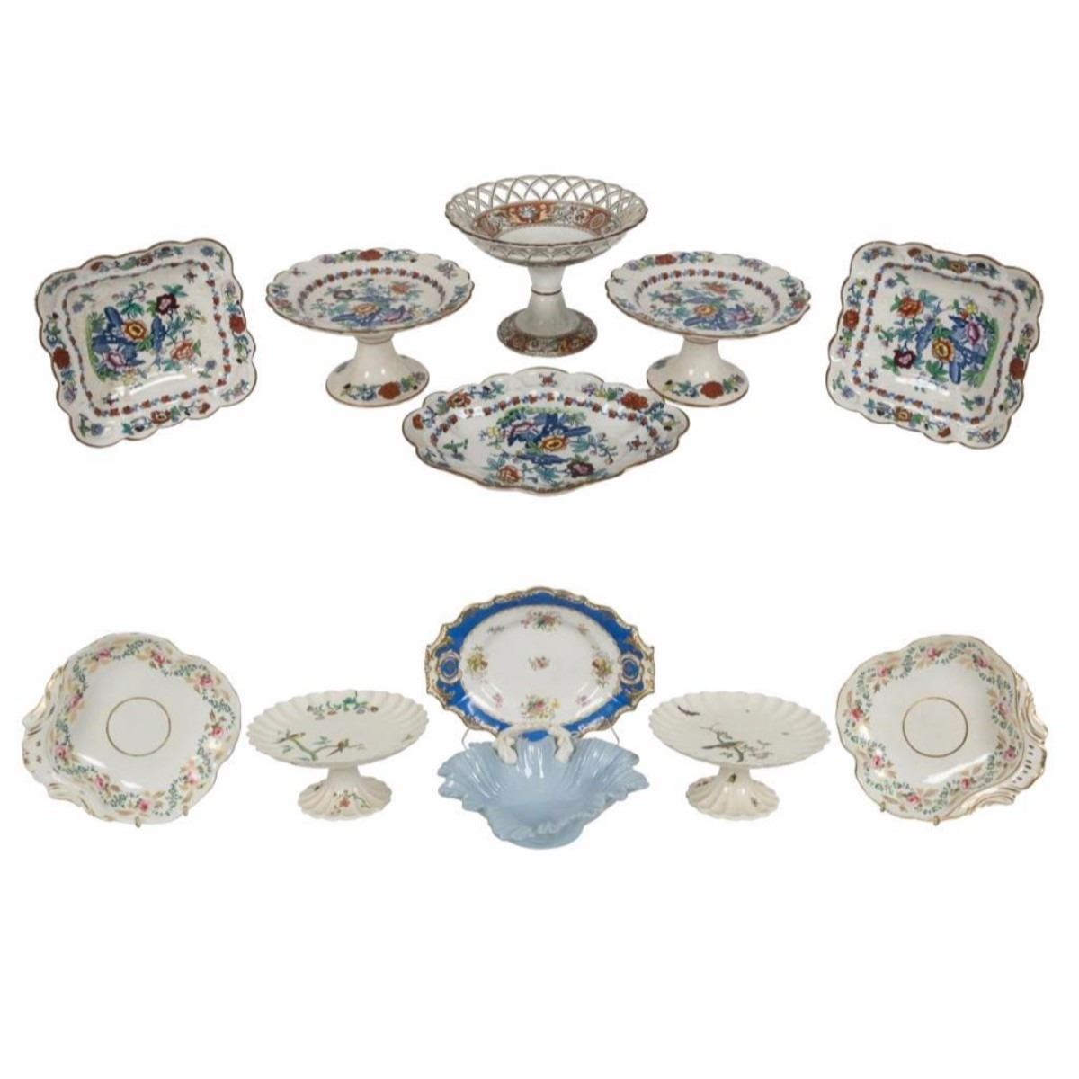 Description - twelve assorted english soft paste compotes and serving pieces. Dimensions - large compote - 7" x 9.75"Condition normal wear from age and use. Overall good.