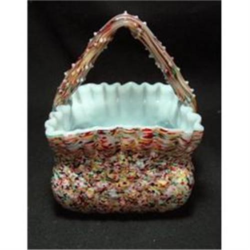 This is a fabulous English basket. The colors are extraordinarily beautiful. There are too many to count. The basket is perfect. This basket was made by one of the English Glass Houses of Stourbridge, England in the latter part of the 19c. The basket is triple cased with a white interior. The bottom part of the basket, everything but the handle and crimping part has a criss-cross pattern to the glass. The crimping is done by hand using a special tool. The handle is the best part. Thorned, multiple thorns and sharp to touch. Almost 7"" to the top of the handle. The basket is 5"" square. Absolutely a stunning piece. Also has a large ground pontil.