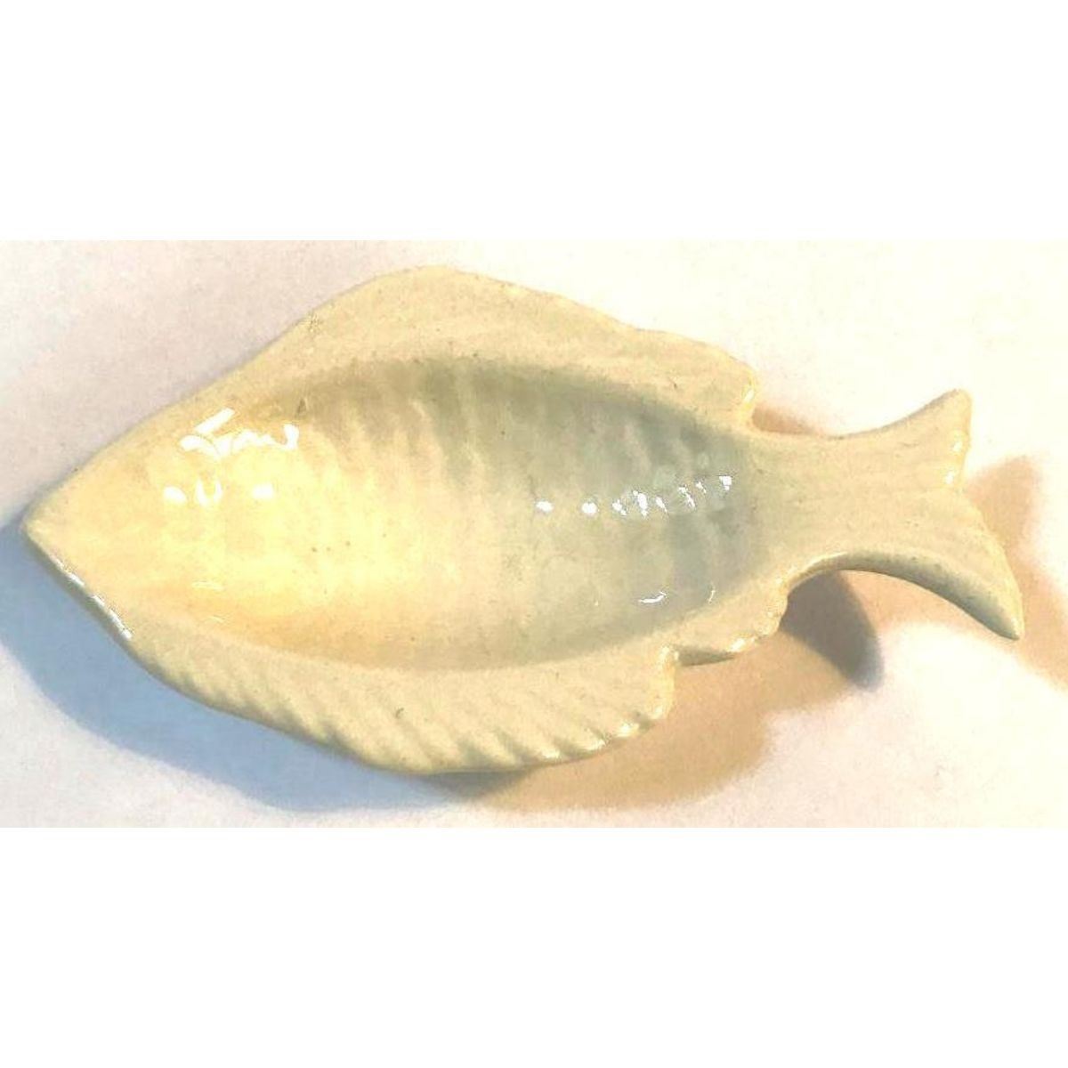 Miniature china pin, trinket or tea bag dish, in the form of a fish. Stamped "Spode Impl England". 4 1/2" W X 2 3/4" H.