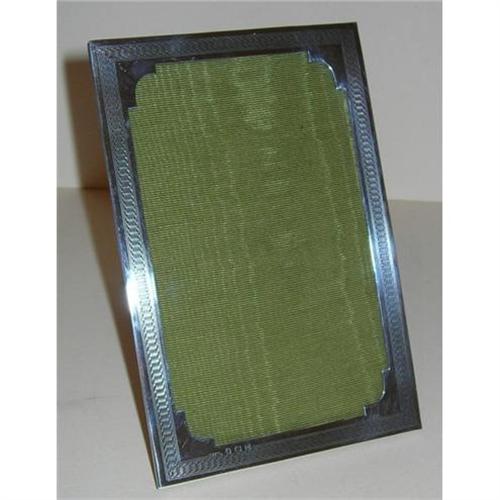 A really very handsome photo frame beautifully decorated with engine turning and very nice detailing to corners, almost a Art Deco feel to it which ties into the date of 1928. The British hallmark is crisp and was assayed in Birmingham.<p>The front is glazed and has a nice green taffeta lining. The frame frame stands on a wooden easel, the backing is made from English Oak.<p>Superb condition measuring 5 3/4" x 3 3/4" with an opening to accept a 5" x 3" picture.