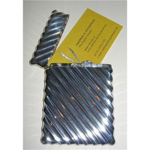 A stunning and very elegant card case with an all over diagonal fluted design.<p>The hinged lid is in perfect working order, it is here that the full English silver hallmark can be seen for Sheffield 1897, so truly antique dating to the late 19th century. The makers mark is also nice and clear, J D & S, for famous James Dixon and Sons silversmiths.<p>It is a great usable size fitting todays modern business cards and credit cards; measuring 4" x 2 7/8".<p>Very stylish, perfect for a lady or gentleman, heavy guage silver and in superb condition.