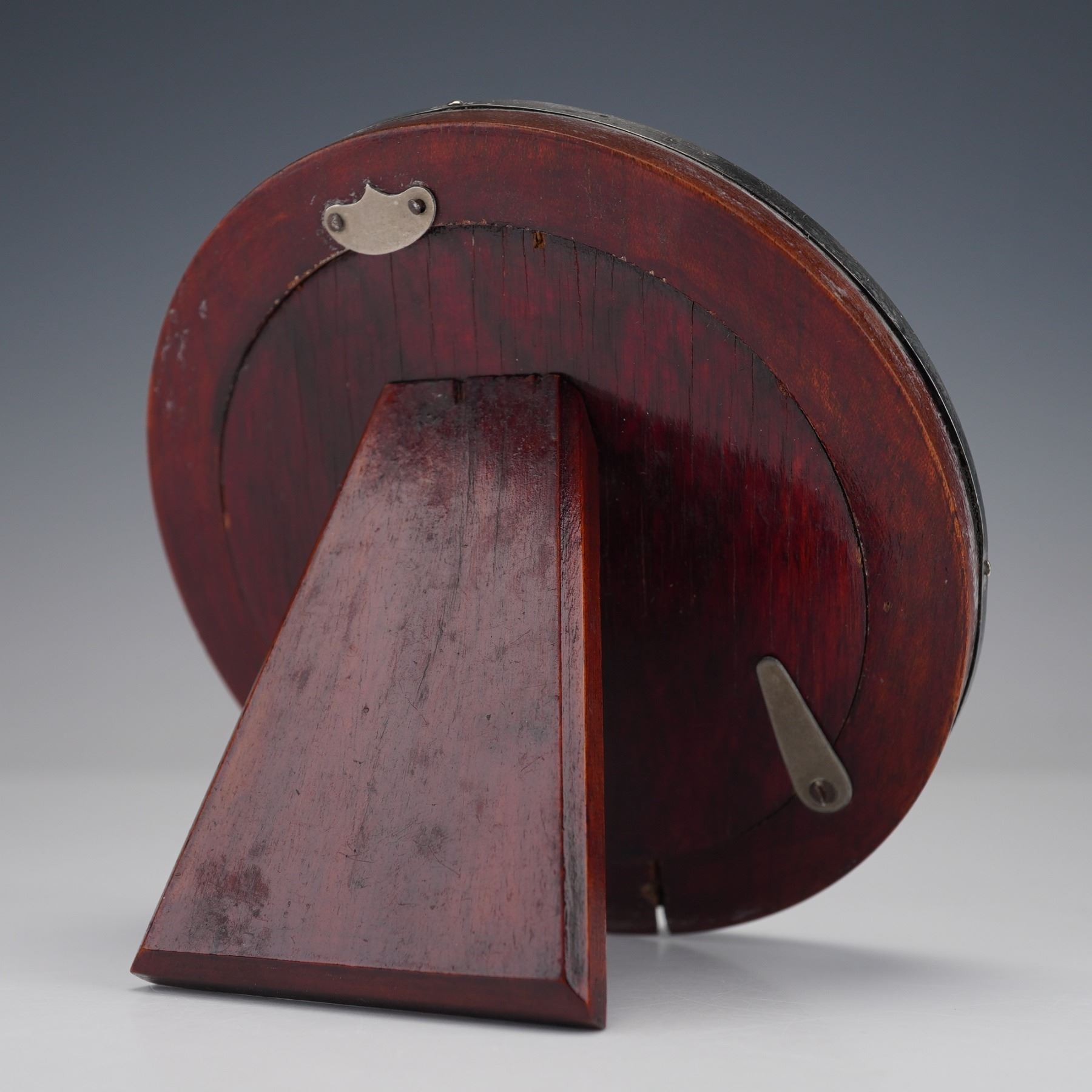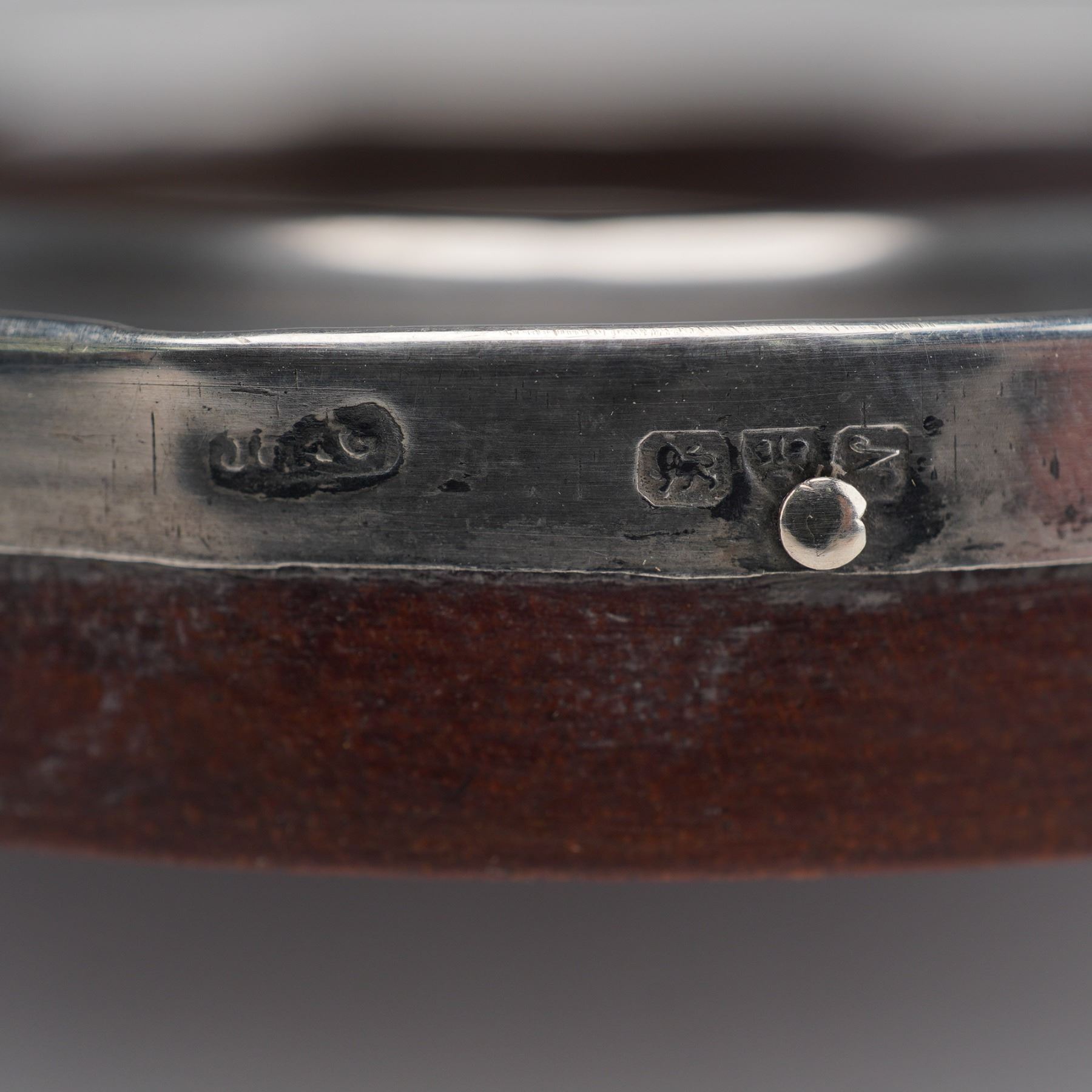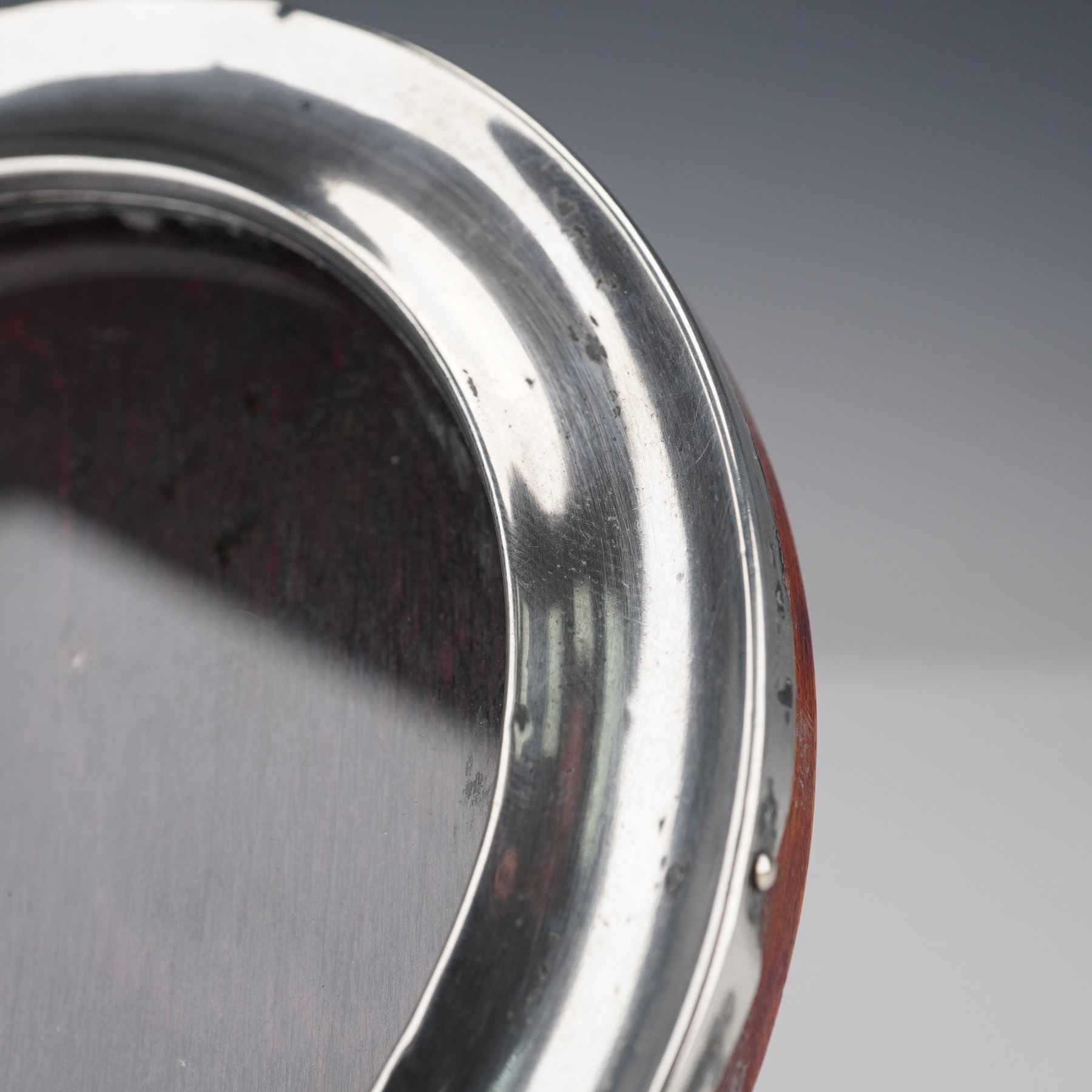 A refined early 20th century English sterling silver and wood picture frame, featuring a smooth circular silver border with clear hallmarks along the rim, set over a rich mahogany backing with a hinged easel support. The silver bears English hallmarks including the lion passant, assay mark, and date letter, indicating authenticity and fine craftsmanship. The combination of polished silver and warm wood creates an elegant contrast, ideal for displaying treasured portraits or miniatures. A beautiful example of Edwardian design, balancing simplicity and sophistication. Gross weight 2.5 oz.
