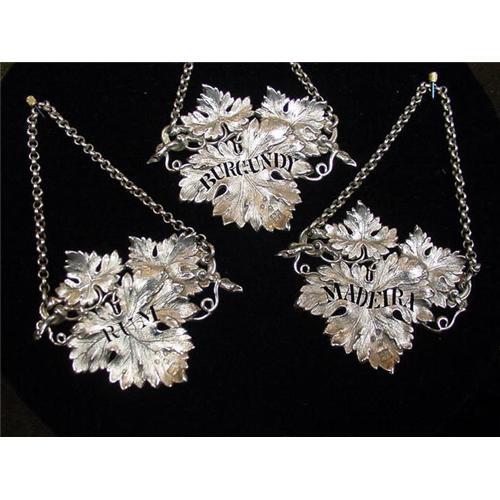 Rare and beautiful English Sterling bottle labels with a highly detailed vine leaf motif and the original heavy chains. Each label measures 3" by 2 1/2". Burgundy, Madeira and Rum are pierced into each label. Hallmarks are leapord head, lion, Victoria head and a "b". Makers marks are R,H,W,L. All three are in excellent condition.