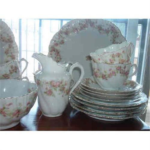 8 cups, 8 saucers, 8 bread and butter plates,2 sandwich plates, sugar bowl and milk jug. Very fine delicate china. No makers marks, just decorators numbers.Slight wear to gold edging.