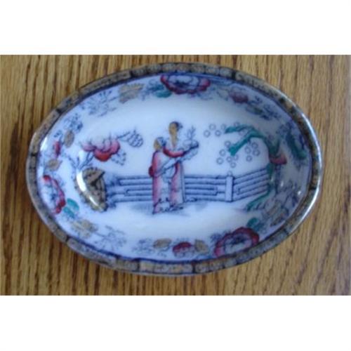 19th Century English transferware small oval dish. Multi colored scene in the Chinese style. Impressed Y on the bottom but no other markings. Measures approximately 5 1/2" by 4" and is in excellent condition.