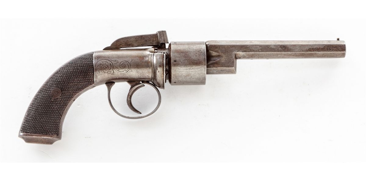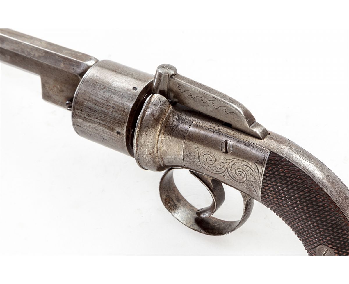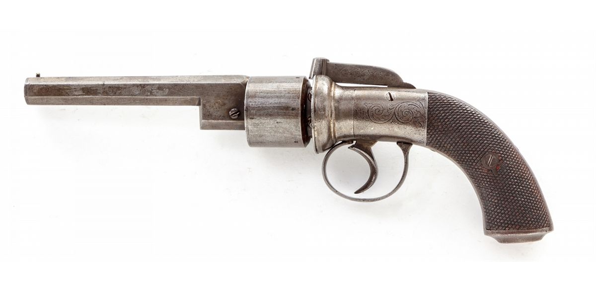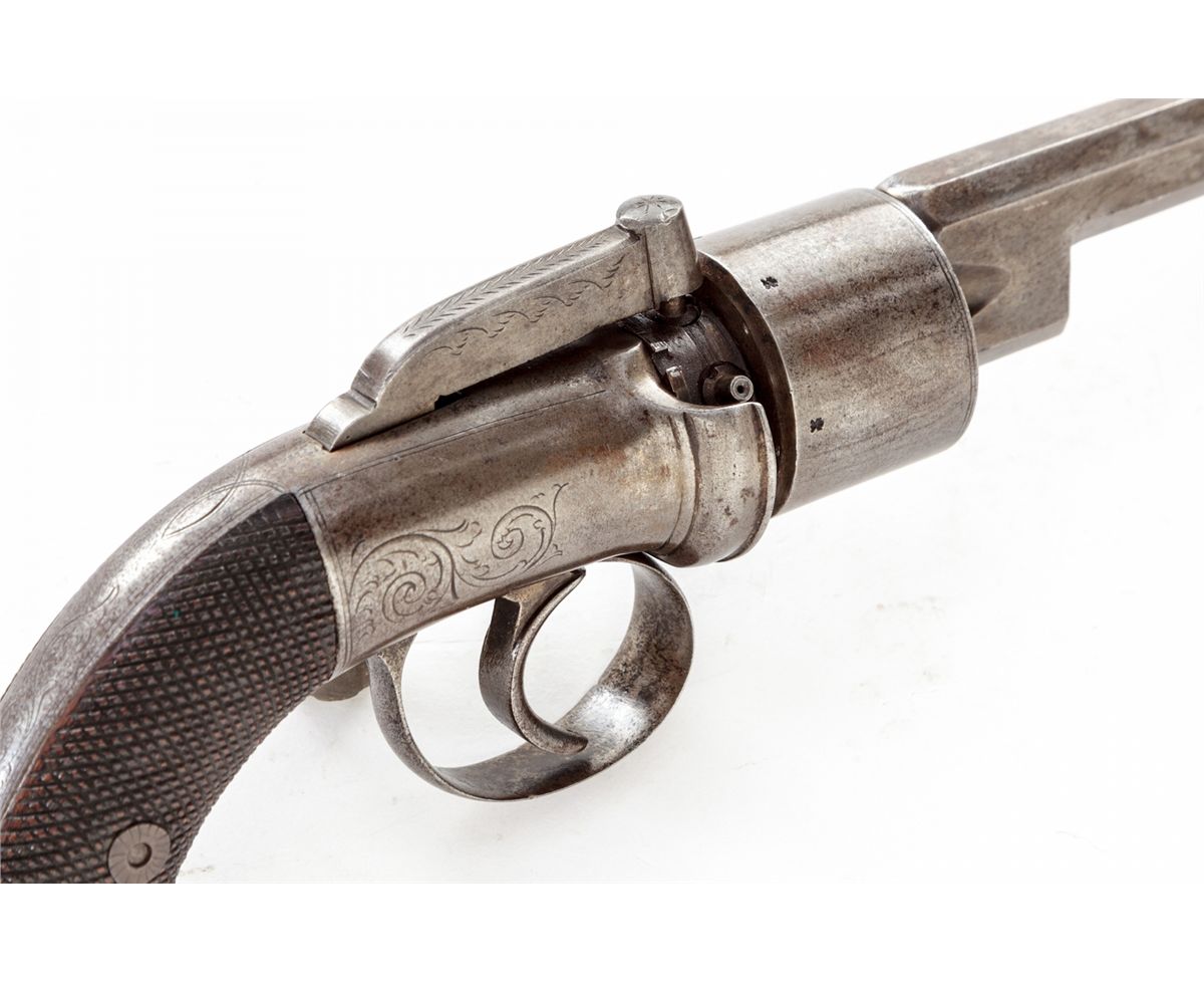 English Transition Type Percussion Revolver, NVSN, .38 cal., 5'' octagonal barrel, flute to right barrel lug to facilitate loading; lightly engraved metal frame, hammer, backstrap and butt cap; checkered walnut grip panels, with brass front sight pin. London proofmarks at each chamber of cylinder and two additional marks on bottom barrel flat. Condition is fine, as cleaned, with light general thinning to scroll detail. Grips with minor flattening. Action is in good working order, smoothbore barrel shows very light pitting. Est.: $1,200-$1,800. (Antique)