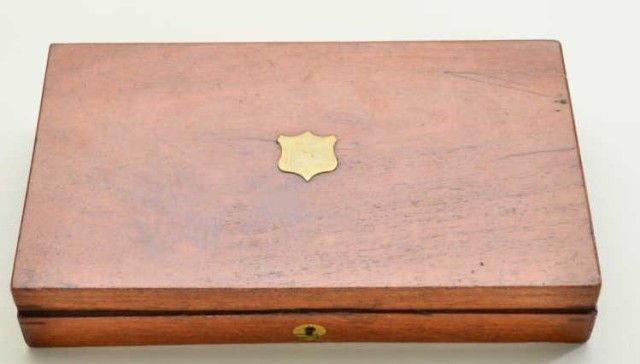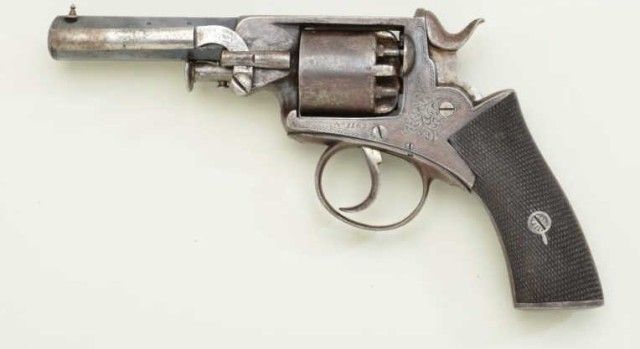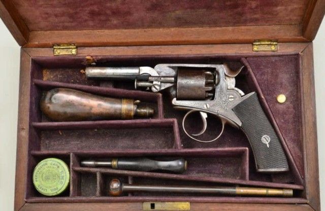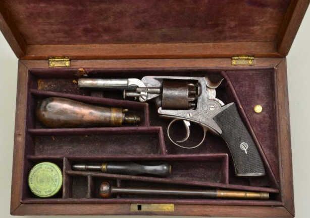 English Tranter style percussion revolver circa 1850-1860’s of pocket size with no mfg or agents name, British proofed with “No 1162” engraved on left side of frame. The revolver is contained within its original tothe period partition style English case. The pistol is approx. 36 cal with 3-7/8” octagon barrel rounded at the muzzle with ram rod on left side and approx 9-1/2” overall. The revolver is lightly scroll and borderengraved with checkered wood grips. The pistol retains approx 30-50% blue drifting to patina with scattered light to moderate erosion and pinprick pitting. The grips are very good, the action is working, thecylinder is not revolving. The case is lined in a purple velveteen and shows impressions from this revolver although case is made in such a way it would accept a 1-3/4 - 2” longer barrel (in our opinion this isoriginal as dealers would often sell shorter guns in a generic case that would fit more than one barrel length). The case contains a period flask, nipple wrench, rod, cap box and original compartment cover. Missing