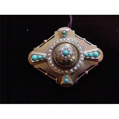 Beautiful victorian english 15 Kt. yellow gold, turquoise and pearl brooch. Reverse - tube hinge, lever catch and locket back. Great condition.