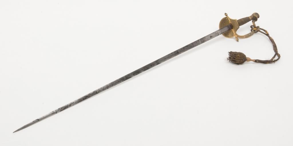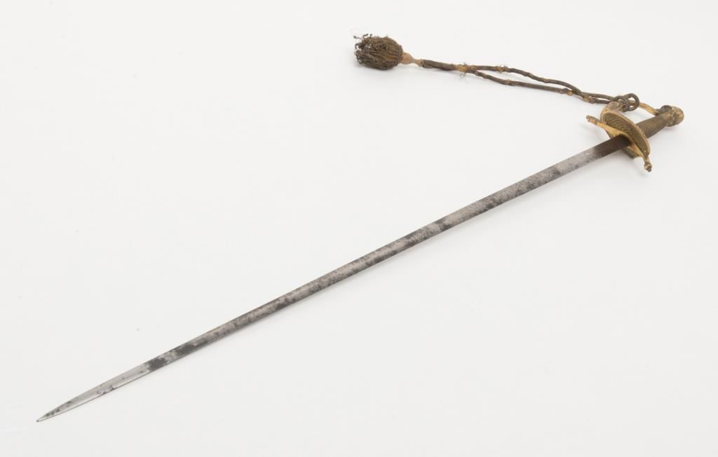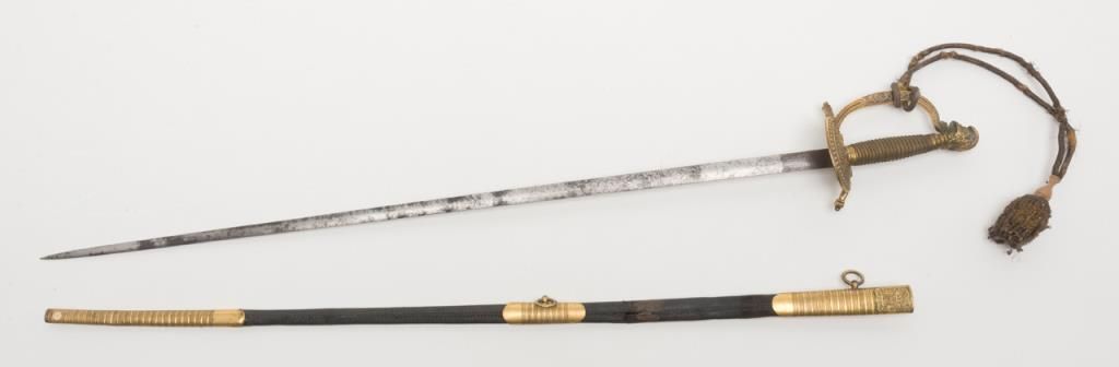 English Victorian Court sword and scabbard, approx. 37” overall with leather scabbard displaying brass mounts; sword is in overall fair to good condition with some scattered spots of erosion on blade, brass guard, grip and helmetedpommel; the throat of the scabbard is marked “C. Smith, Embroiderer and Accoutrement Maker, No. 12 Piccadilly, London”, some cracking and separation to the leather. Est.: $250-$500.