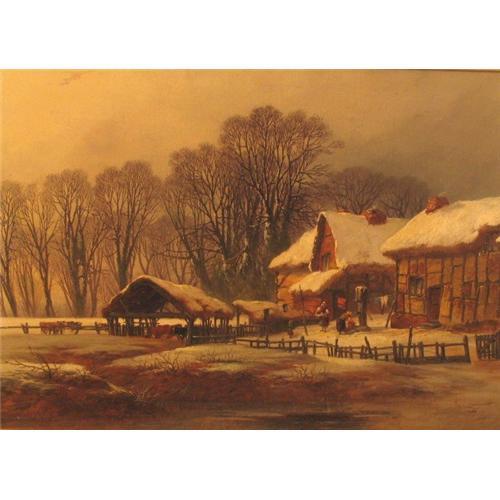 Attributed to William Pitt (English) Depicting a snowy barnyard scene, this picture offers a realist depiction of the heart of Englands countryside with it s thatched roofs and open barn for the livestock. There exists an inscription on the stretcher "This painting was inscribed on the back of the original canvas Whitnash near Leamington Warwickshire Wm. Pitt 1854". Warwickshire is located an hour from London and most often recognized for Stratford-upon-Avon. Measuring 35" by 25" and housed in its original stretcher with orignal keys. There appears to have been minor amounts of in painting to the trees. This piece has been professionally cleaned and relined and is housed in a new frame.