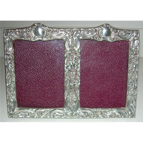 This antique English silver picture frame is hallmarked in two places for Birmingham 1899 together with the makers mark of S*B.<p>This is a stunner with a really stylised art nouveau design in pierced repousse work. At the top of each aperture is a vacant cartouche which could be engraved if desired.<p>The original backing is all leather and opens to change photos, there is glass in each side to protect your chosen picture.<p>It remains in superb condition (with one tiny break in the silver, hard to see but mentioned for accuracy - see second photo). 6 3/4" wide x 5" tall and will accept two pictures measuring 3 1/2" x 2 1/2".