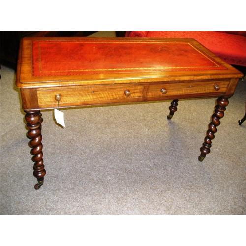Charming little English walnut library table with twist turned legs supported on original brass castors. Two large size drawers with cock-beading. Mahogany drawer linings & bottom's. To the rear matching false drawers & knobs. The top with delicate thumb moulding edges having a tooled & gilded light red leather writing surface. The att. photo's show the front, side & back of this lovely table which is in very good, highly polished condition