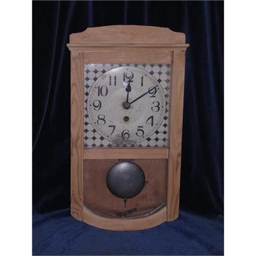 English pine wall clock with a round black and white face.