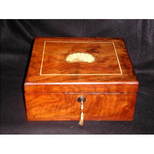 Exquisite hand made 19th century large size English walnut document box has satinwood inlaid frame on the lid with a fabulous satinwood cartouche in the center. Expert craftsmanship in all areas with brass hinges,working lock and key and black round back plate. Lined in pale green paper with cream fern design. A great size for holding all types of treasures. Excellent condition. Measures 12L X 11D X 5.75H.