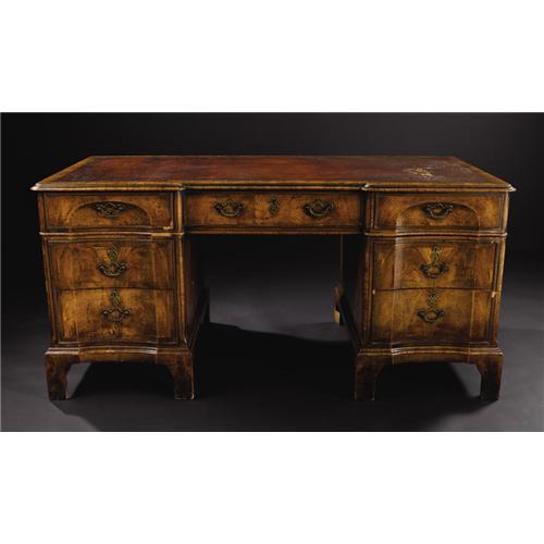 <B>An English Walnut Pedestal Desk</B></I><BR><BR>Unknown maker, English<BR>Nineteenth Century<BR>Walnut<BR>Unmarked<BR>30 inches high x 61 inches wide x 30 inches deep<BR><BR>With three-drawer desktop covered with inset leather above three upper drawers and two side drawers, pedestals of serpentine and block-front design.<BR><BR> <B>Condition Report:</B> Distress to leather top, minor losses to moulding.<BR><BR><b>Shipping:</b> Requires 3rd Party Shipping (<a target="_blank" href="http://www.heritageauctions.com/common/shipping.php">view shipping information</a>)