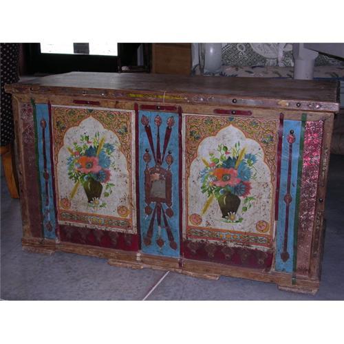 English wooden gypsy chest with a hand painted tin front and a hinged top.