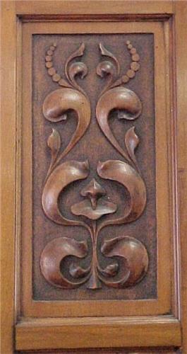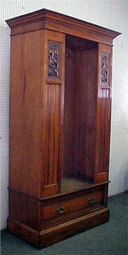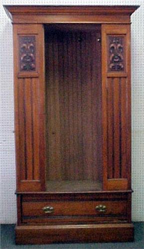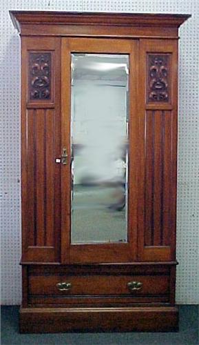 English armoire; molded overhanging cornice above single door with beveled mirror; door is flanked by two decorative carved panels over fluted design; one long drawer on bottom; molded base; measures 6' 10" high x 3' 4" across x 17 3/4" deep; 19th C. WILL NOT SHIP.