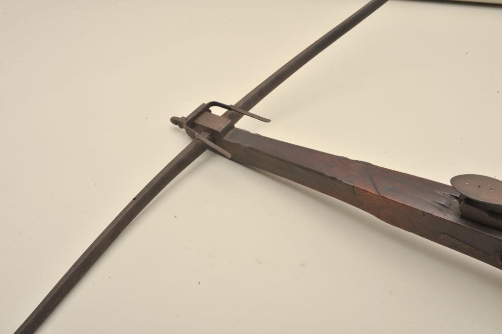 from tip to end and 31 ½” across forged steel bow. The cocking lever in integral to the stock. The condition is good to very good overall with some minor rust and pitting on the metal. The wood stock is also good plus showing normal age and imperfections. The bow string is missing. These were used in hunting small game in British Isles until replaced by air guns and small caliber rimfire arms later in the 19th century. Great decorator. Est.: $600-$1200