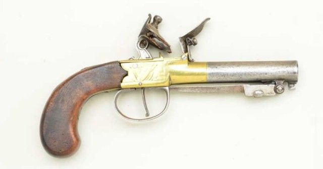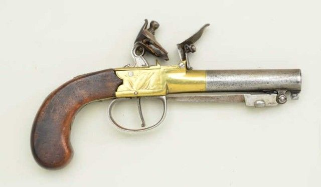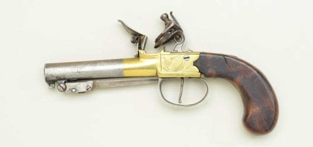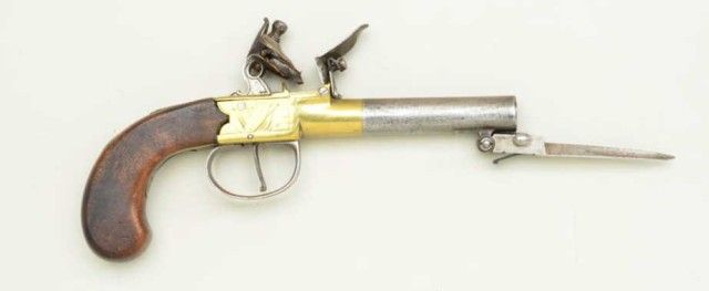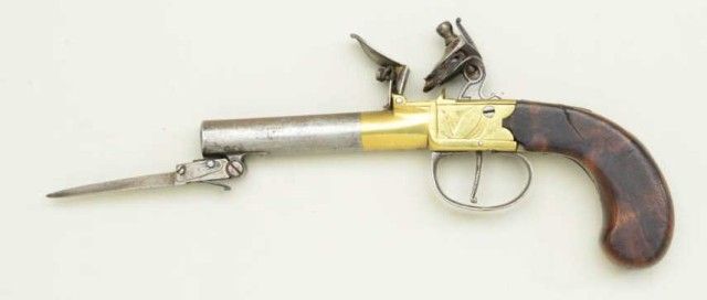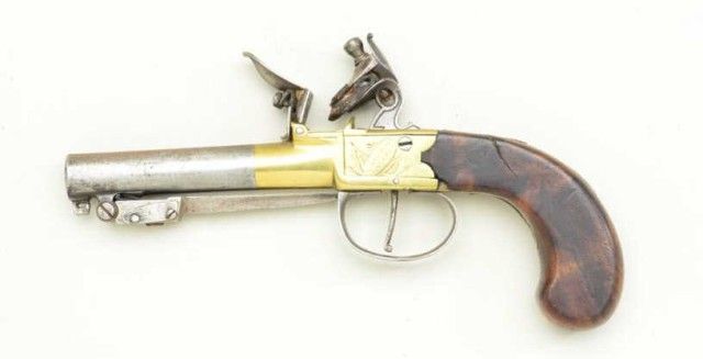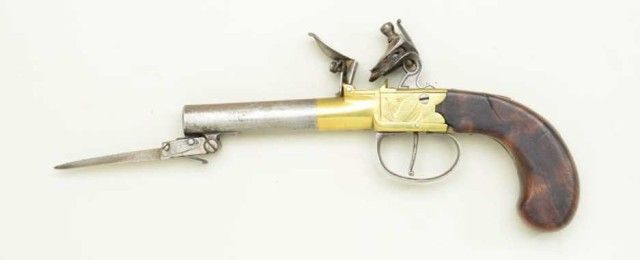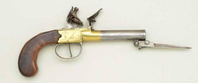 English center hammer flintlock pistol with under mounted spring bayonet and brass frame, signed CINDERTONA & ----NTER, London. The pistol measures 8 ¼” overall with 2 ¾” barrel of approx. .45 caliber with false rifling.The condition is good to very good showing some light cleaning and polishing to brass. The barrel and bayonet show some light pitting and a gray patina. The stocks are good with small losses and minorimperfections. The bayonet springs but is not locking. Est.; $350-$700