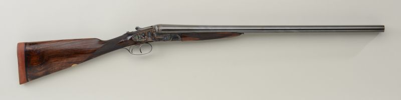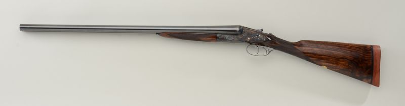 English full side-lock SxS shotgun marked W. Richards, Liverpool and Preston on barrels in 12 gauge with 25” barrels choked improved cylinder right, full left; double triggers, auto ejectors, nicely scroll and game birdengraved with English style straight stock, #9528. The underside of the barrels show nitro proofs for 2-1/2” shells (now opened to 2-3/4”) and marked imported by Thad Scott, LTD. The gun is nicely re-conditioned andshows well-restored blue and case hardened finish with checkered select walnut stocks; the action is tight, the bores are bright, the gun locks up tight and the engraving is exceptional. The stock measures 14” to end of wood and nearly 15” to end of rubber recoil pad; 2-1/2” drop at hell, 1-5/8” drop at comp with no cast. A good combination of features for game shooting and an attractive side-lock gun; 98-99% restored finish remains with minor use since restoration. Est.: $3,000-$6,000.