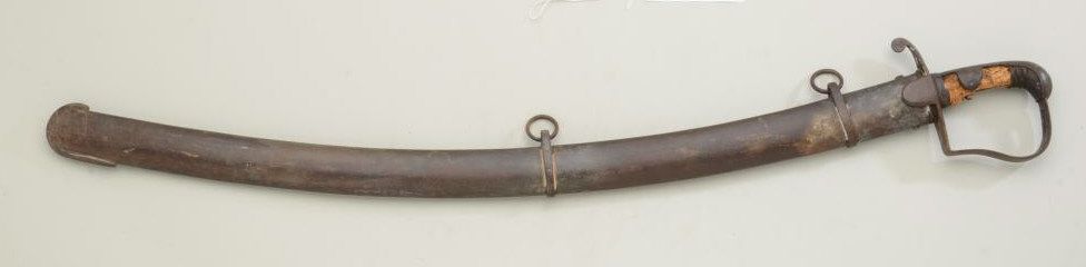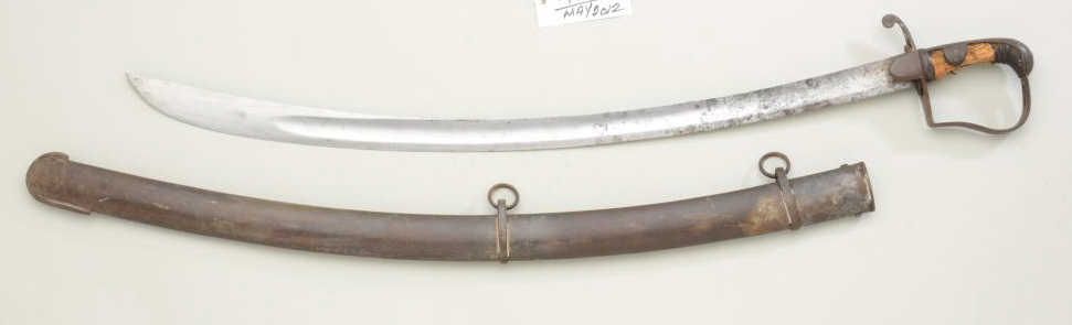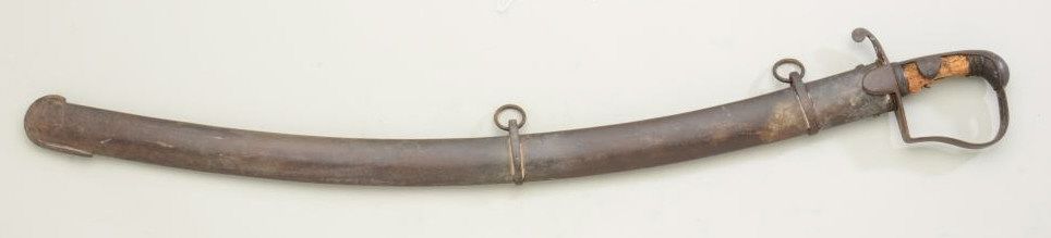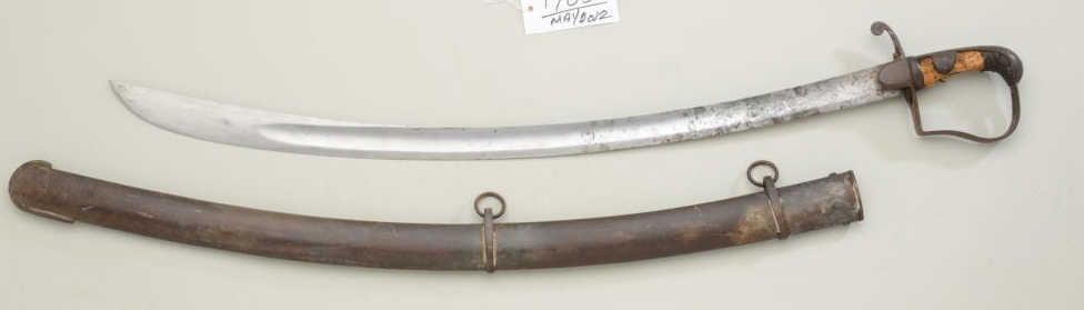 English heavy Cavalry style saber, circa 1800 to 1815, signed Osborn on back of blade near the hilt. The blade very good at the front, some pitting and spotting at the rear; the scabbard and hilt show a deep patina withlight to moderate rust and erosion and a dark and heavy patina. The grip appears to have been eaten away by termites or animals, and is only partially retained. Found in an old Louisiana collection and is inout-of-the-attic condition. Est.: $200-$400