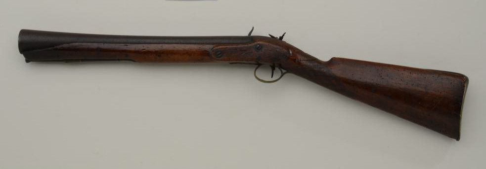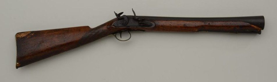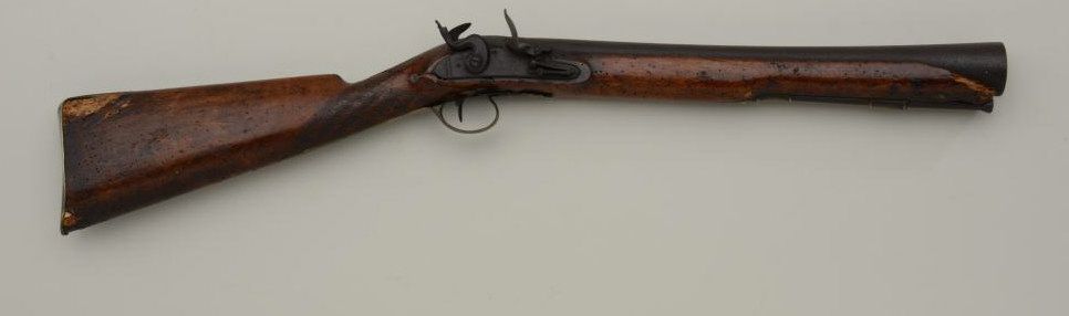 English iron barrel flintlock blunderbuss in “as found out of the attic condition” circa about 1810 to 1830. The gun measures 32” overall with 17” barrel which flares to 1 ¾” across the muzzle with approximately 1 ½inch bore. The iron barrel and lock show light to heavy scattered pitting and erosion. The lock is less pitted than the barrel which shows deep pits. The top jaw is missing and the action does not work. The stockshows many wormholes and breaks with losses particularly in the areas of the butt plate and around the muzzle. The brass mounts show a deep patina and are nicely engraved. There are small losses around the area of the lock. Few guns of this era are found completely untouched and unrestored as gun collectors over the last hundred years have restored just about everything at least once, sometimes twice and in some cases we areseeing guns with their 3rd 4th and 5th reincarnation which sadly seldom improve them. Est.: $500-$1,000