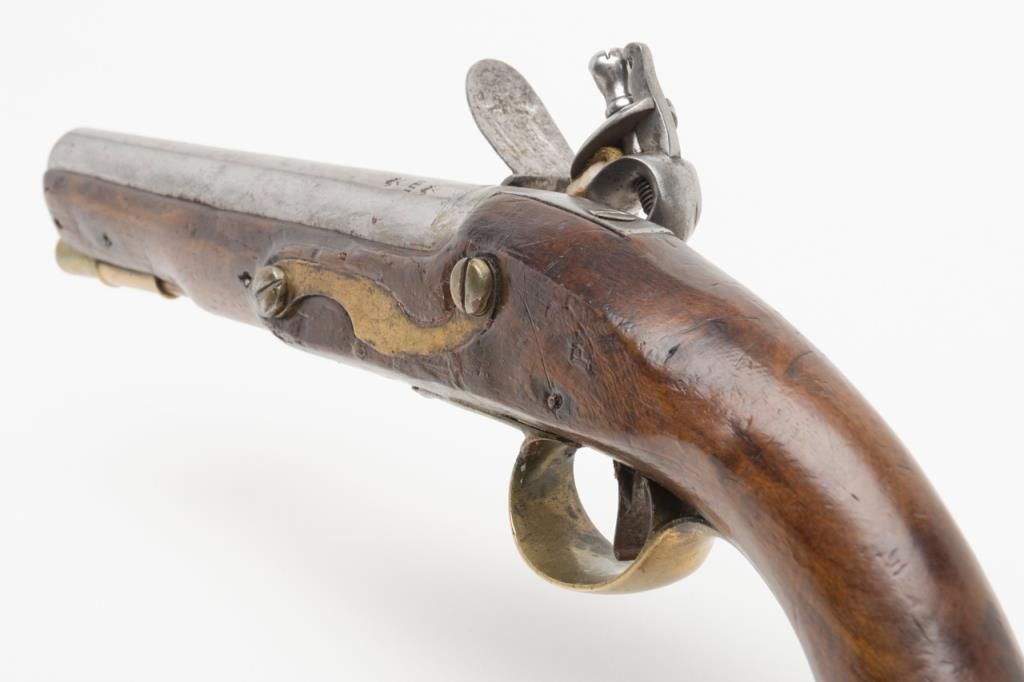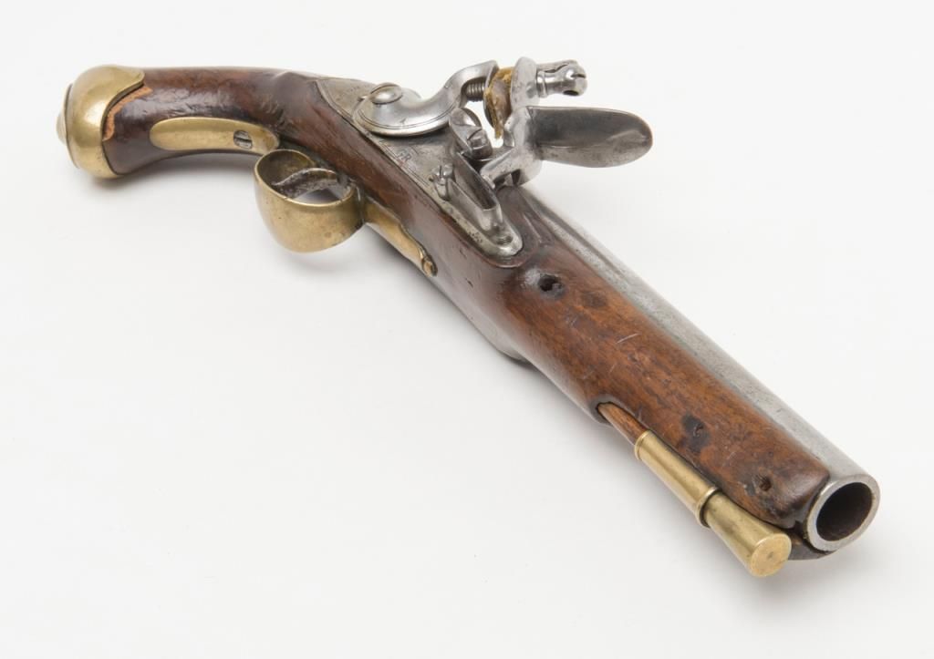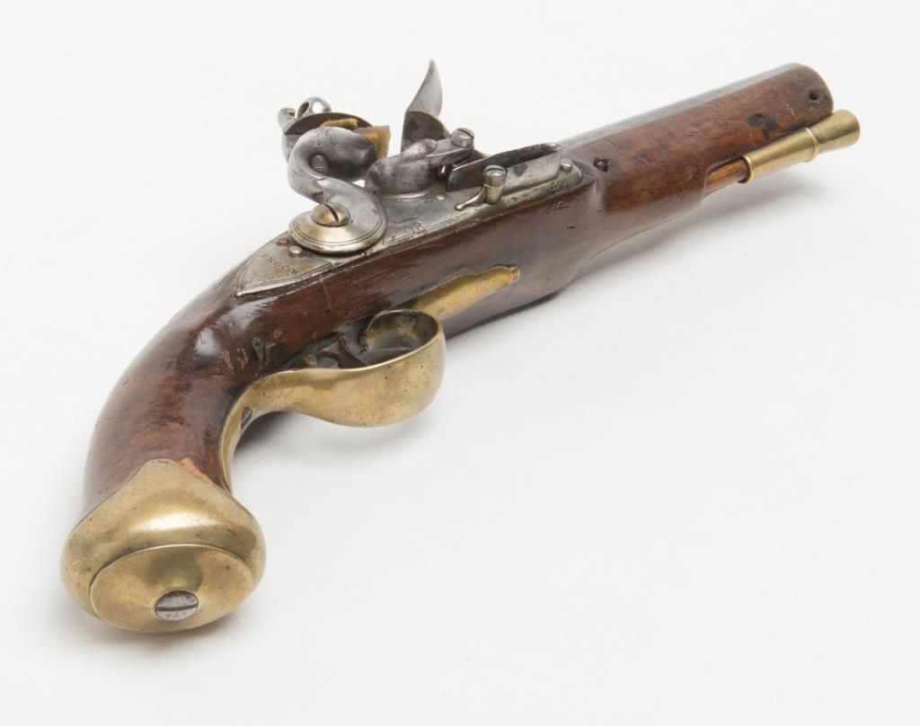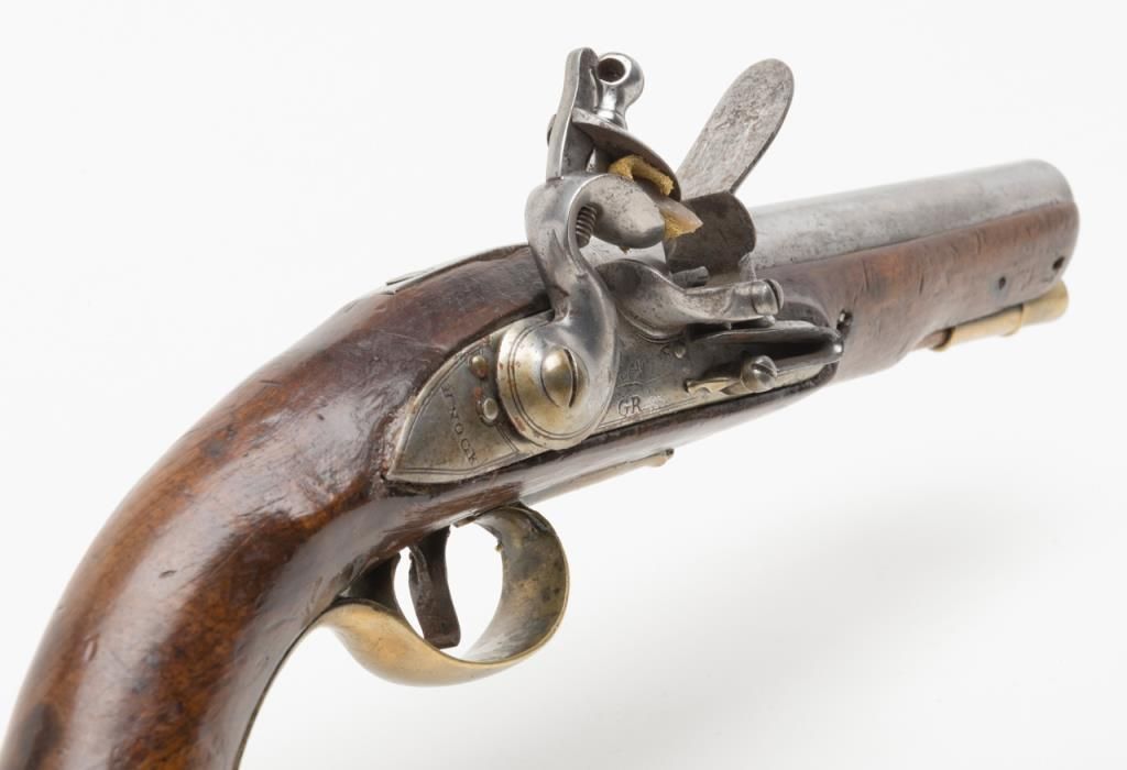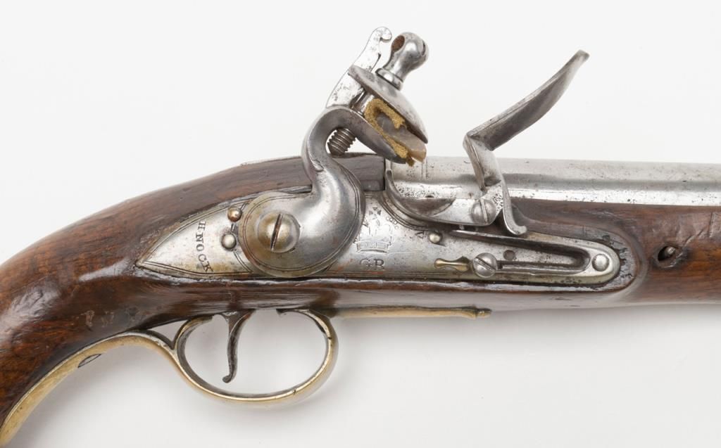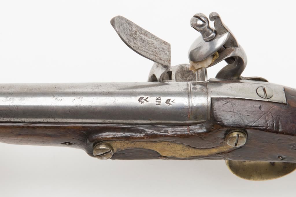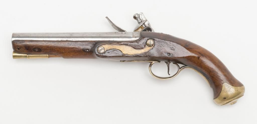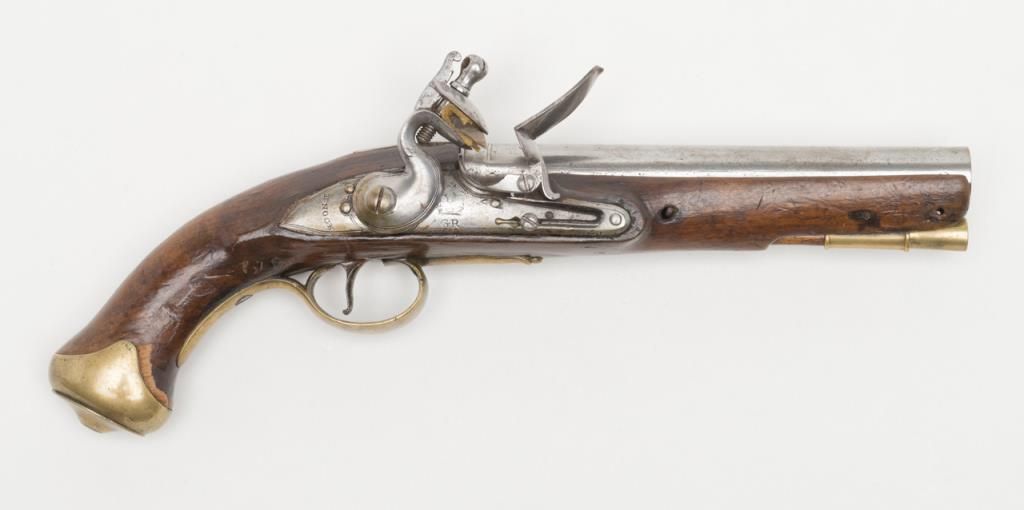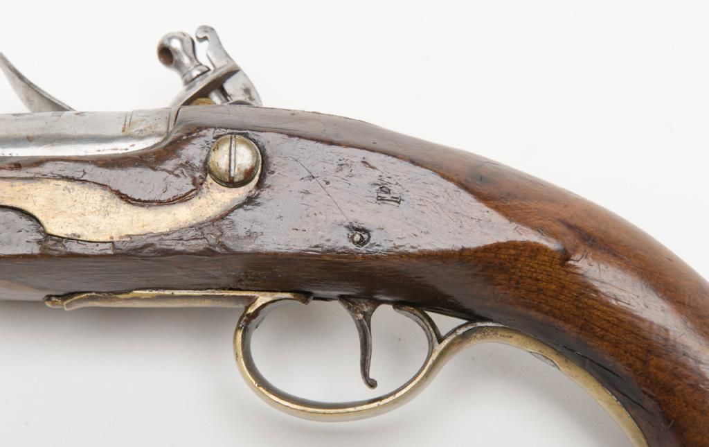 English military issue flintlock single shot pistol by famous maker H. Nock, .68 cal., 7-5/8” barrel that was shortened during use, wood stock, brass mounts in overall good to very good + condition showing a light grey patina to metalsurfaces, crown over GR marking on lockplate with proofs and “HN” inspections on left side of barrel at breech; crisp action, stock is good + with “P” proof on left side above trigger, scattered wear, old mars and scratches and an approx. 1” x ¼”chip out of the butt on the right side of the brass butt cap; wood ramrod with flared brass tip retained. (Antique). Est.: $700-$1,400.