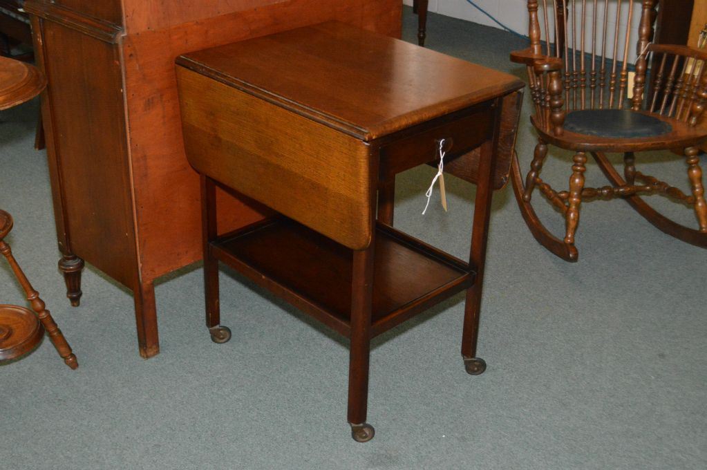 English oak drop leaf single drawer tea trolley