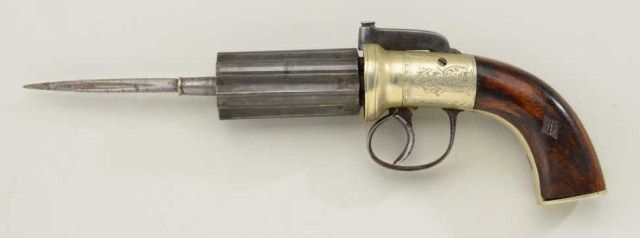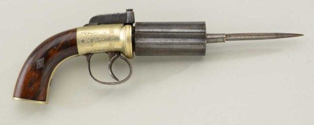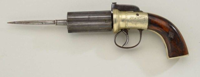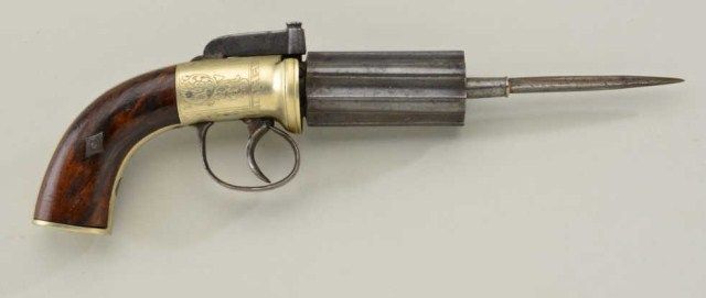 English pepperbox pistol with removable spike bayonet and engraved alloy frame wood grips British proofed circa 1850’s to 60’s. The pepperbox measure 8 ¼” overall with 3” barrel cluster of approximately .38 caliber withsix (6) shots. The metal surfaces remain in good condition traces of original color some minor erosion and pin prick pitting. The frame is sharp and crisp, the grips are very good plus with minor imperfections. Theaction works well, the bayonet is genuine to the period and measures 4 1/16”. Refer “Blades & Barrels by Gordon Frost” pages 26 & 27. Est.; $800-$1,600