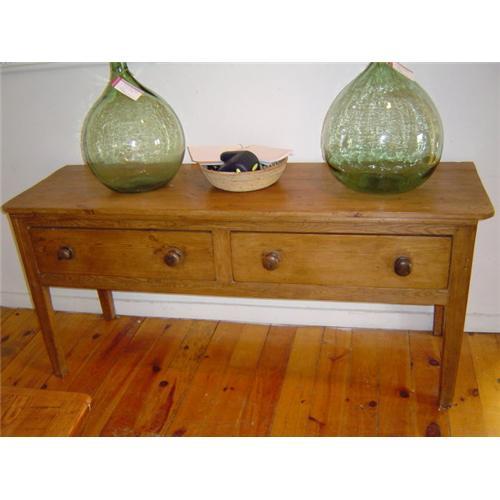 This English pine serving table is perfect as a side piece in a dining area or hall, or as a piece behind a sofa . Two very large drawers with wood pulls make for wonderful storage. The pulls have been replaced, but the rest of the serving table is completely original and in fine condition