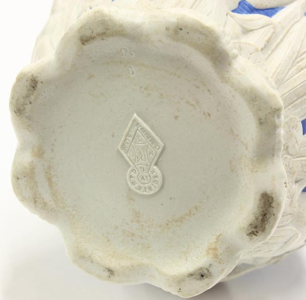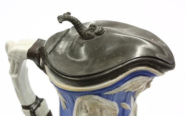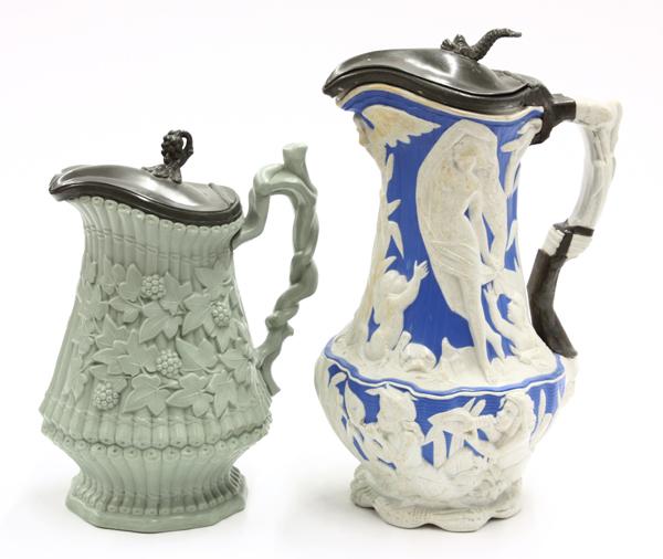 (Lot of 2) English pewter lidded pitchers, one having a grape and leaf decorated body with a vine form handle dated 1849, together with a blue and white decorated pitcher (restored) having a classical scene surrounding the body and rising on a naturalistic base and dated 1882, largest 12''h
