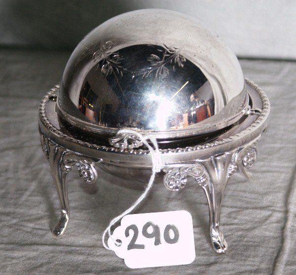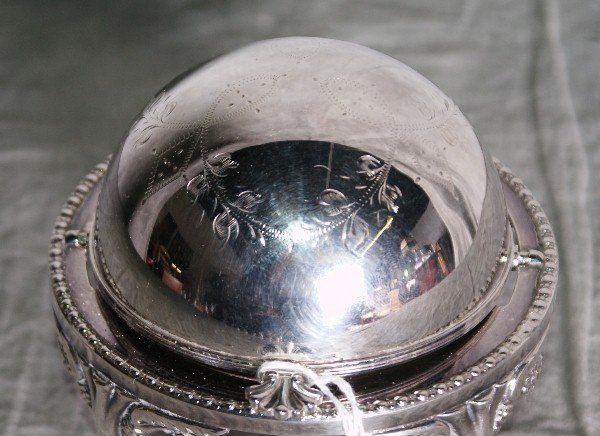 English roll top domed silver plate butter dish. H:4.5" D:5"