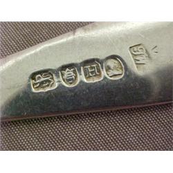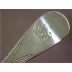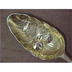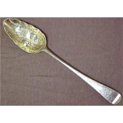 English silver berry serving spoon, raised berry and leaf design on bowl with scalloped rim and gold wash, handle with engraved lion and fluting, hallmarked John Wren 1777-1803, London, 9" long, 2.0 oz.