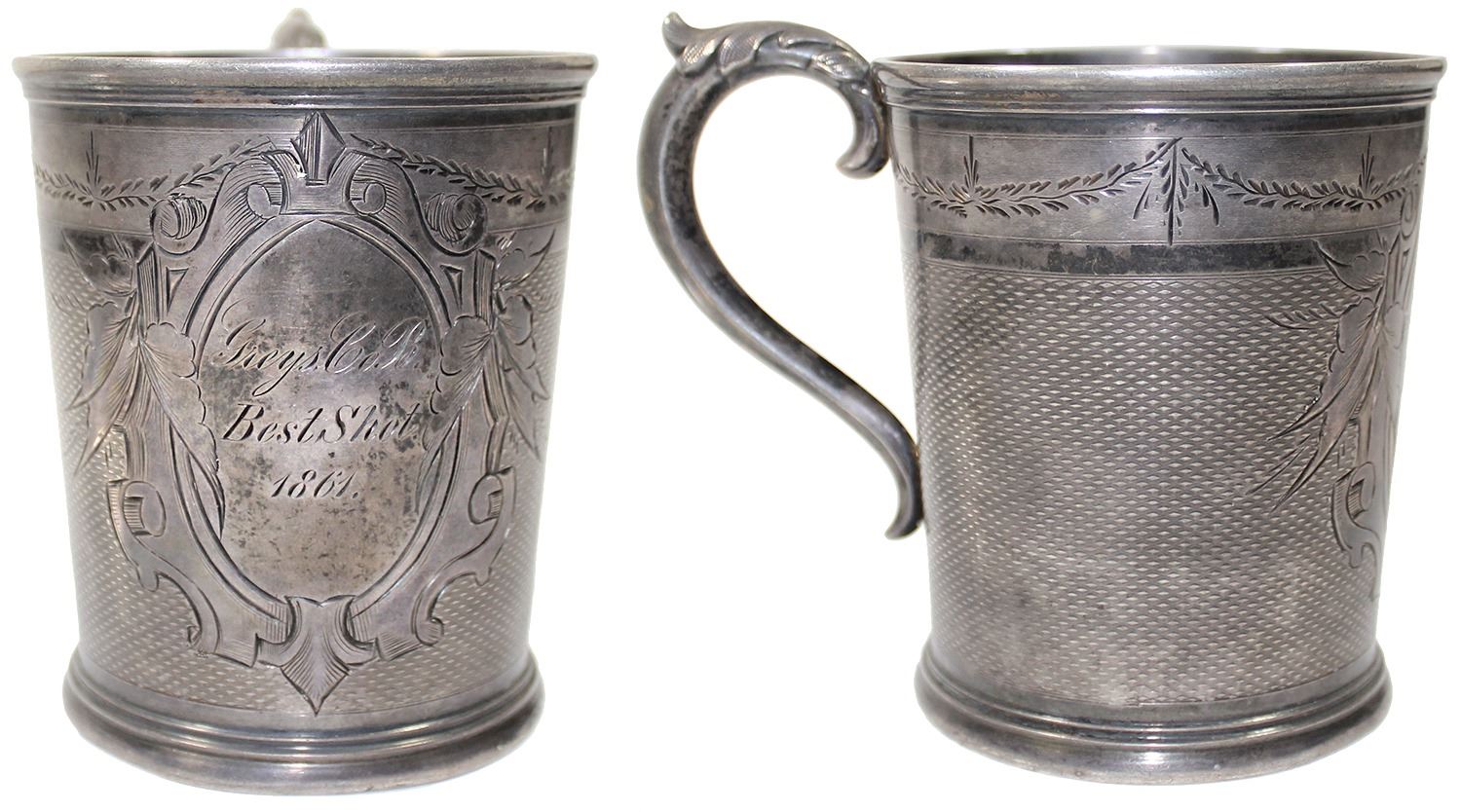 English silver cup with W& H hallmark (Walker and Hall, Sheffield), engraved on side "Greys Co. B / Best Shot / 1861. 126 grams, 3-1/2" tall, 2-5/8" diameter. Attractively engraved presentation cup with handle, a possible Civil War connection (perhaps Confederate), marked "Greys Company B. Best Shot. 1861." on front and Walker and Hall (as W& H), an English silversmith, touchmarks and "5" on bottom. Pedigreed to the Nicholas A. Penachio collection (Skinner auction of November 2018, lot #99). (Note: Further research indicates the maker may instead be Wood & Hughes of New York, active 1840-1890.)