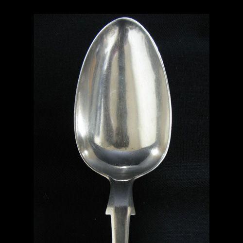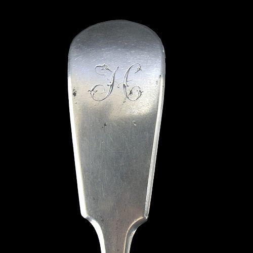 English sterling silver serving spoon; hallmarked on back of handle London 1842/43 H.L.; monogrammed H on front of handle; 5.6 oz. (surface scratches)