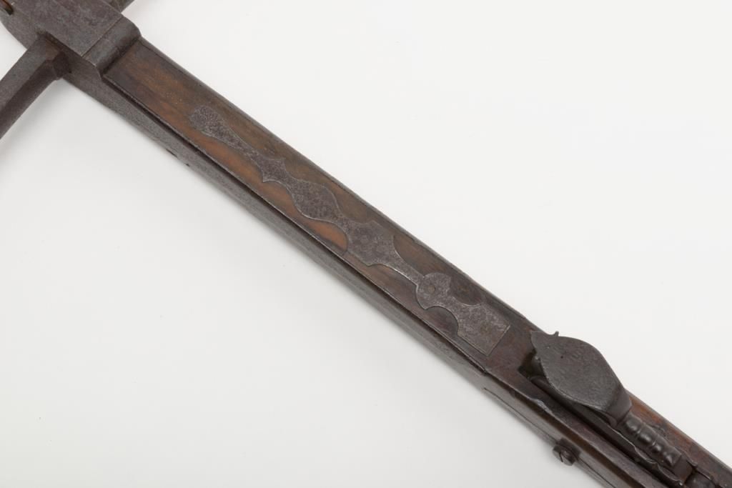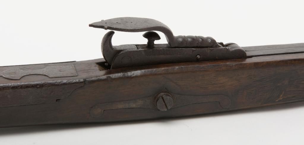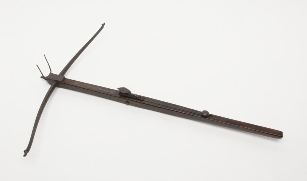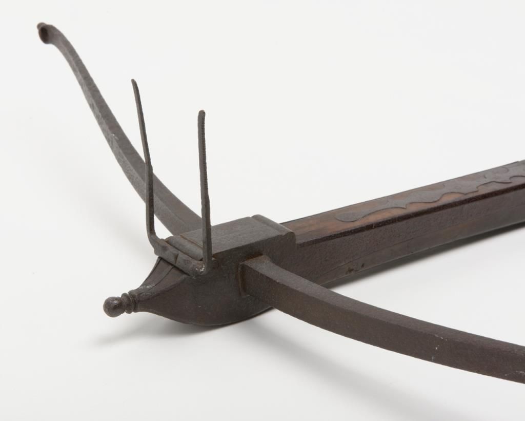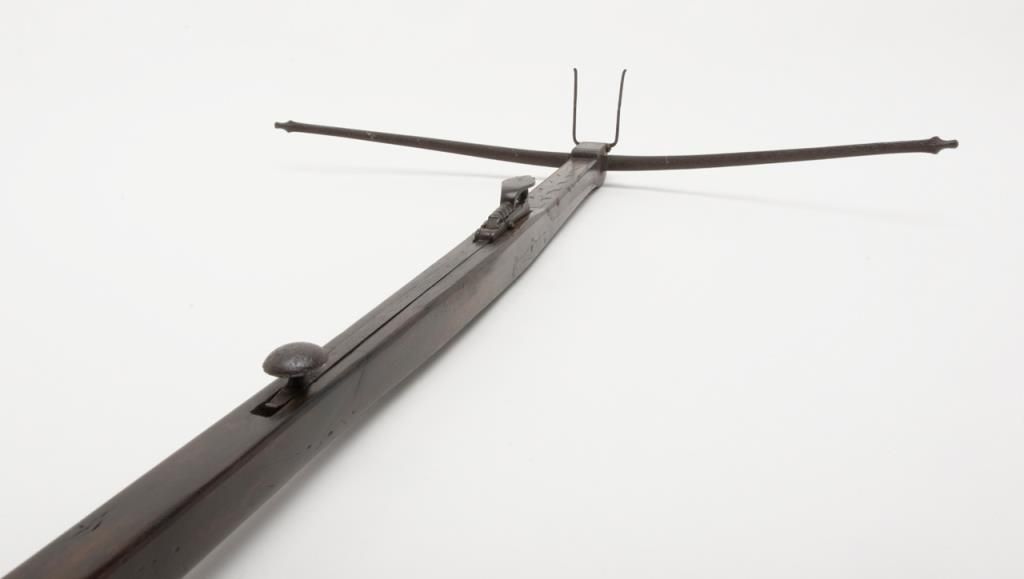 English stone bow circa 18th to 19th century signed “Willow, London” on the release mechanism with spanner in the stock. The bow measure approximately 26” across curve and 34 ¾” from end-to-end. The makers name is lightly engravedwith scroll borders and light engraved trim. The metal surfaces show light to slightly heavy scattered pitting and erosion within a dark patina. The wood portion is in good condition showing some scratches, mars and dings but nomajor cracks or significant distress. Est.: $1500-$3000