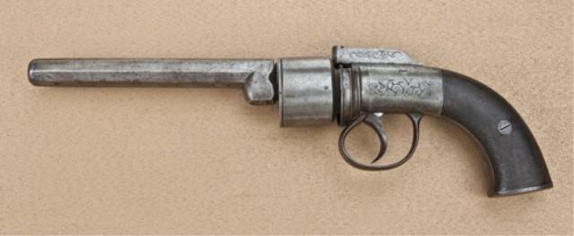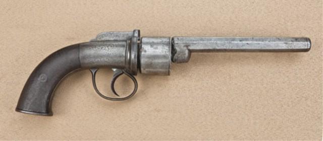 English transition double-action revolver signed John Jones on right side of frame, marked “Coths Improved Revolver” on top flat of octagon barrel, approx. .38 caliber percussion. 6-shot, 6” octagon barrel, 12-3/4” overall, grey to brown patina finish, checkered wood grips, Birmingham proofs. The metal surfaces show an even grey to brown patina finish, some scattered light to moderate erosion and surface pitting. The grips show some wear at the top of the checkering and darkening, and are fair to good overall. The action is working, the barrel is slightly loose o the pin. Generally good overall. This style pistol spanned the gap between the pepperbox and cylinder revolver. Is this the gun asked for by the man with a lisp? He wanted a Colt and got a Coth. Est: $350 - $700