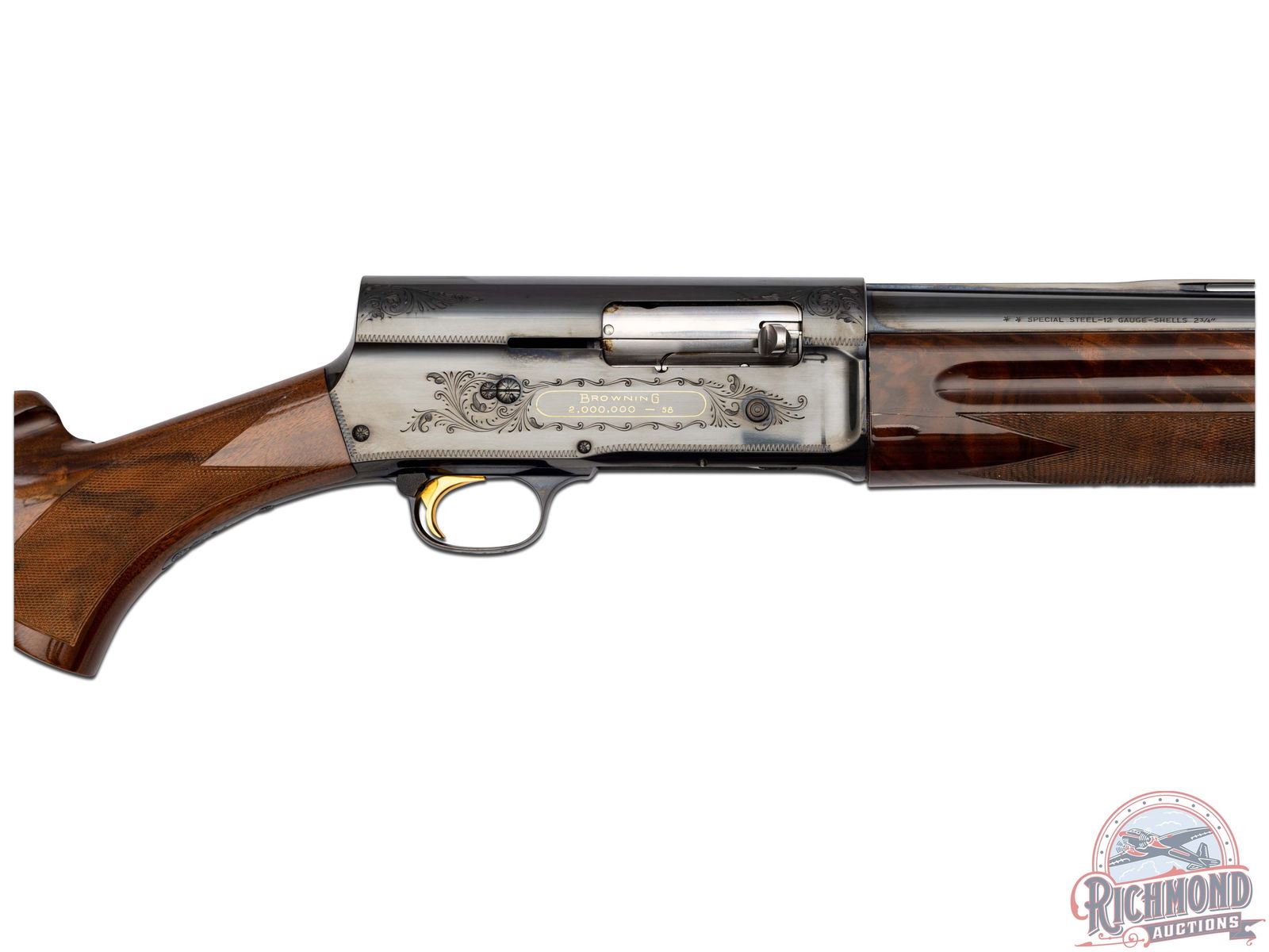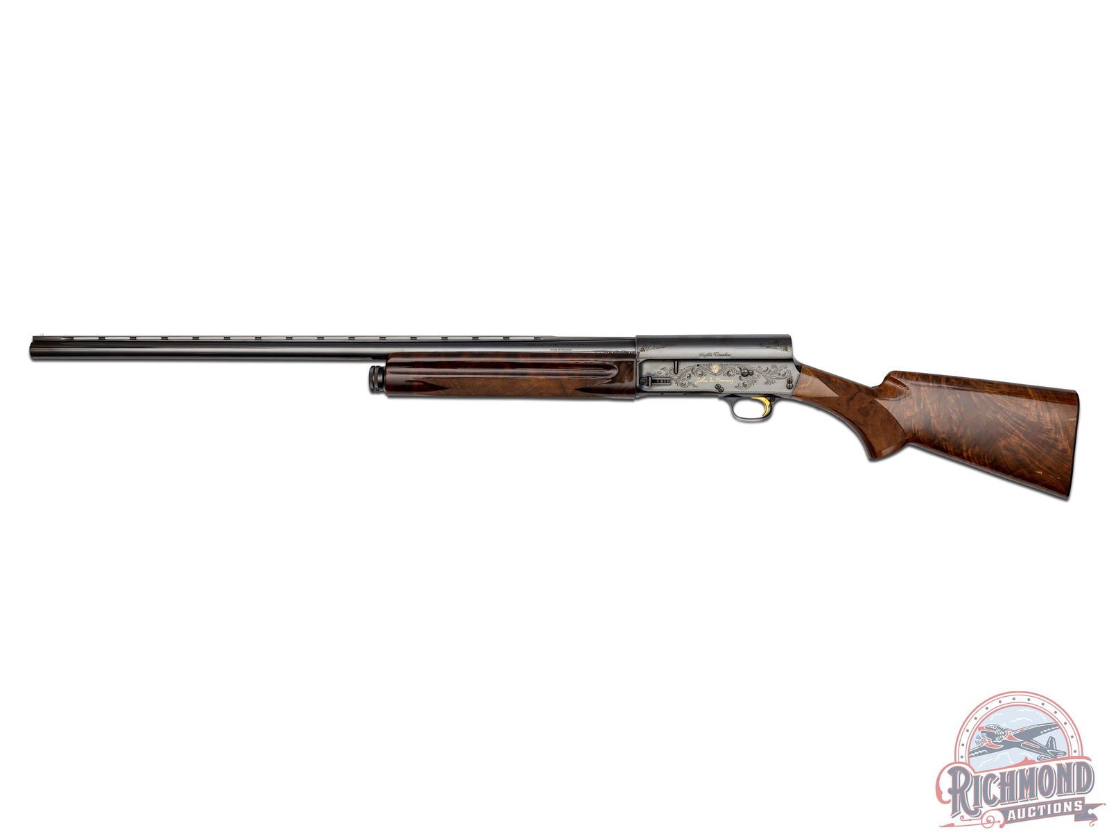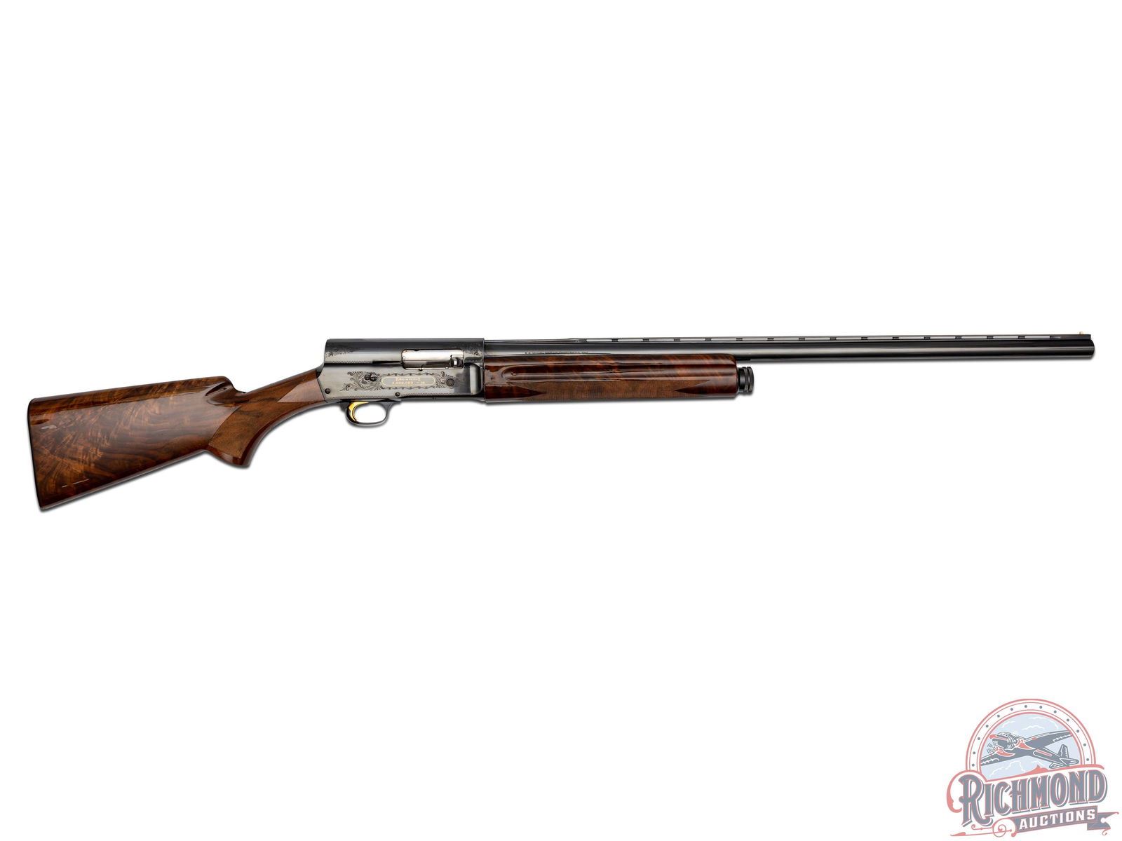 A-5 semi-automatic shotgun manufactured in 1971 for Browning by FN in Belgium. One of 2500 manufactured between 1971 to 1974. Blued round 27-1/2" fluid steel barrel with raised ventilated rib, bead front sight, fixed modified choke and 2-3/4" chamber. Blued takedown floral engraved receiver marked "Light Twelve" with John M. Browning's signature and portrait in gold on left side. Right side features floral engraving with "Browning" name and serial number in gold. gold-plated trigger with push button safety and tubular magazine. Walnut feather crotch full pistol grip checkered stock with Browning hard rubber butt plate. Matching walnut checkered forearm. Includes original factory black luggage case with Browning booklet. LOP: 14-1/4". DAC: 1-1/4". DAH: 1-3/8". CALIBER: 12 GA. S/N: 2,000,000-58. FFL STATUS: Curio & Relic.