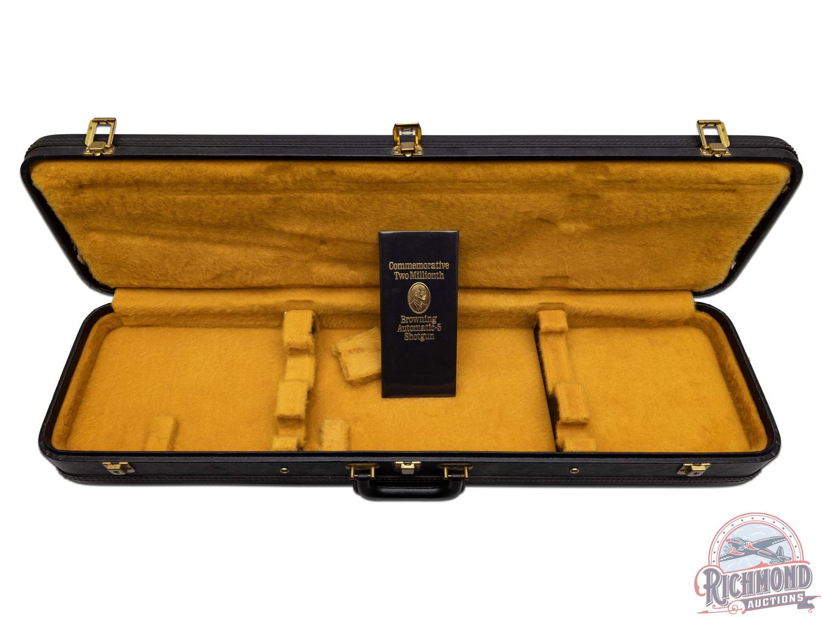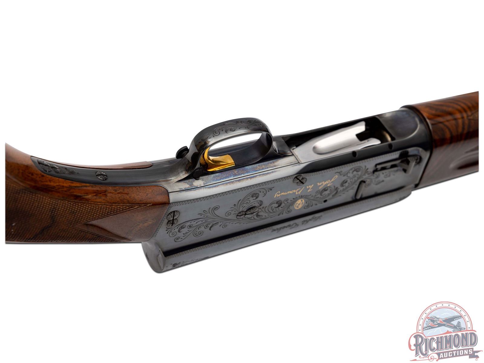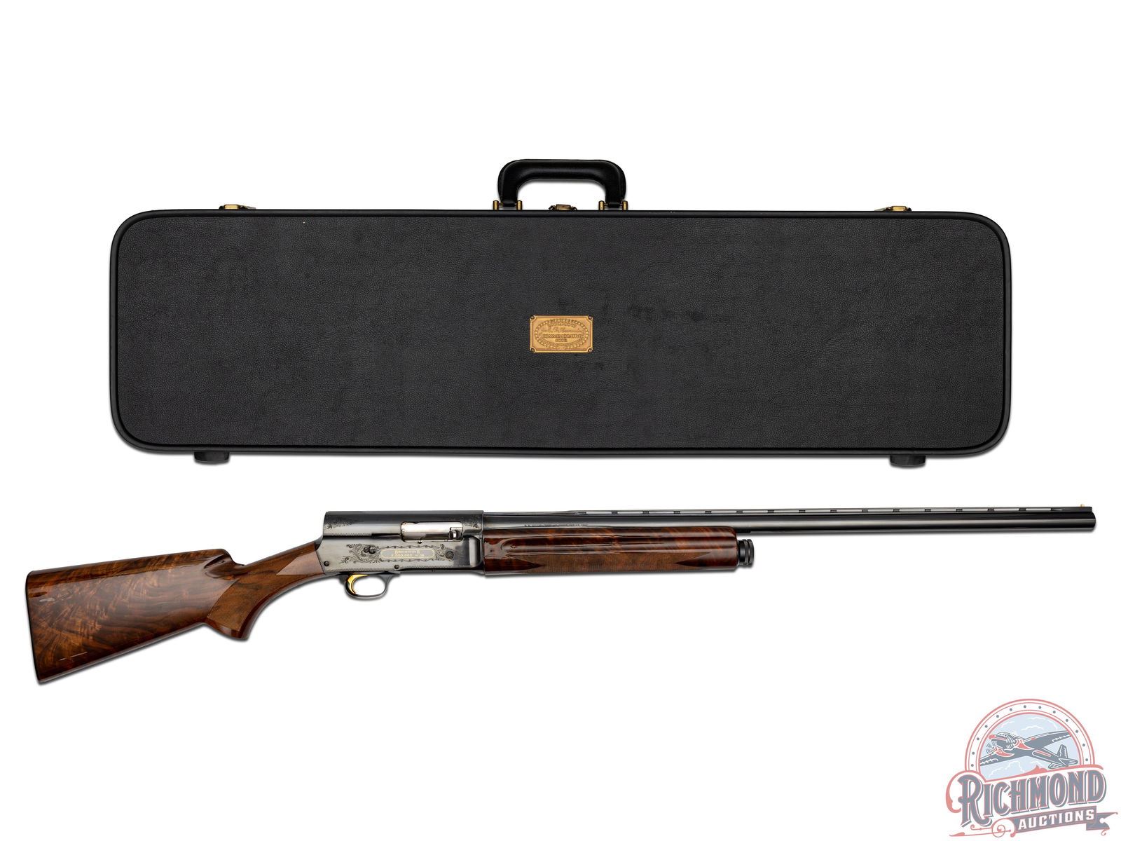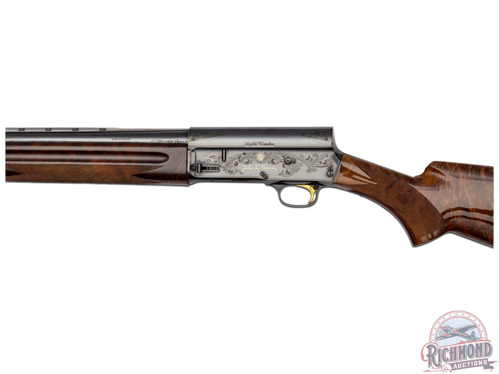 A-5 semi-automatic shotgun manufactured in 1971 for Browning by FN in Belgium. One of 2500 manufactured between 1971 to 1974. Blued round 27-1/2" fluid steel barrel with raised ventilated rib, bead front sight, fixed modified choke and 2-3/4" chamber. Blued takedown floral engraved receiver marked "Light Twelve" with John M. Browning's signature and portrait in gold on left side. Right side features floral engraving with "Browning" name and serial number in gold. gold-plated trigger with push button safety and tubular magazine. Walnut feather crotch full pistol grip checkered stock with Browning hard rubber butt plate. Matching walnut checkered forearm. Includes original factory black luggage case with Browning booklet. LOP: 14-1/4". DAC: 1-1/4". DAH: 1-3/8". CALIBER: 12 GA. S/N: 2,000,000-58. FFL STATUS: Curio & Relic.