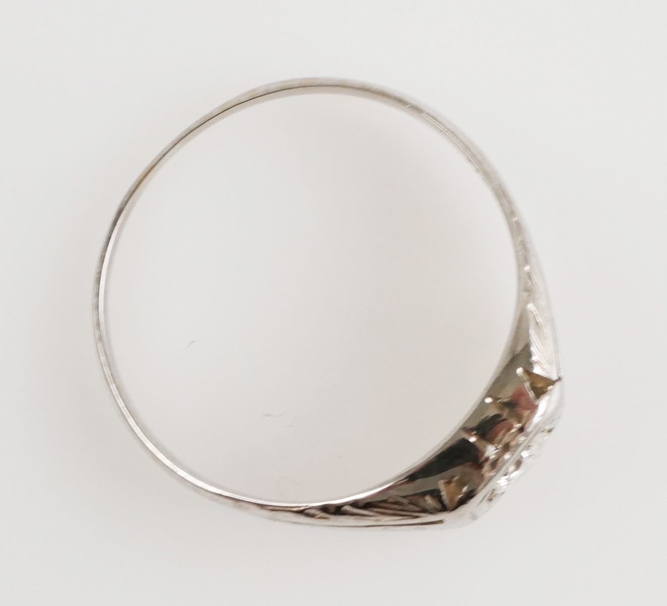 .20 ct. single stone diamond set in 14K hand engraved white gold. Gypsy set round brilliant cut I-1, H-I color. 2.40 grams total weight. Size 7 3/4.