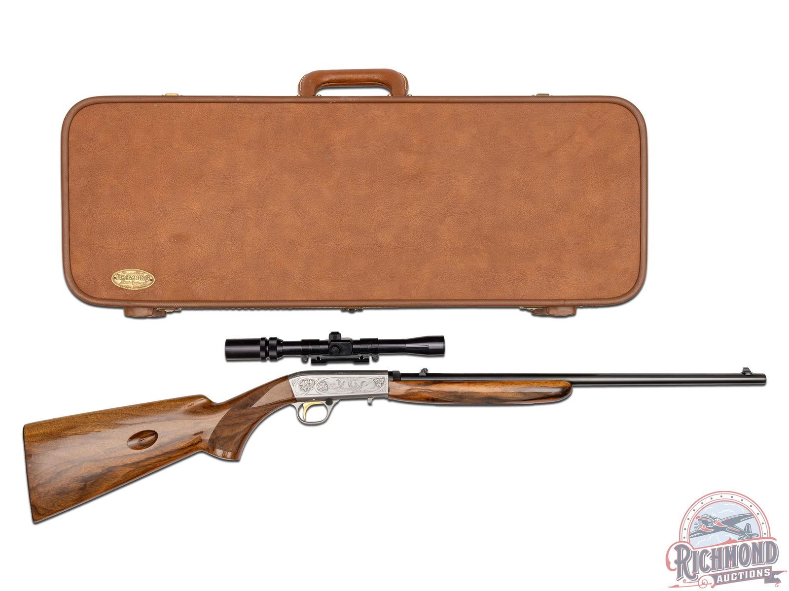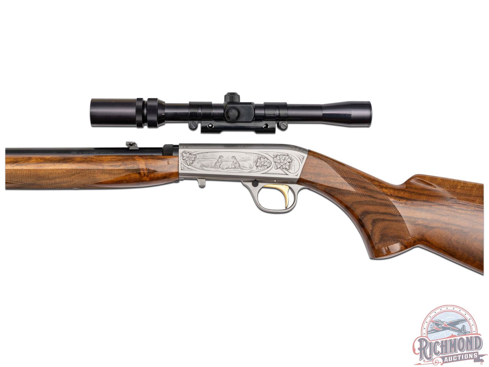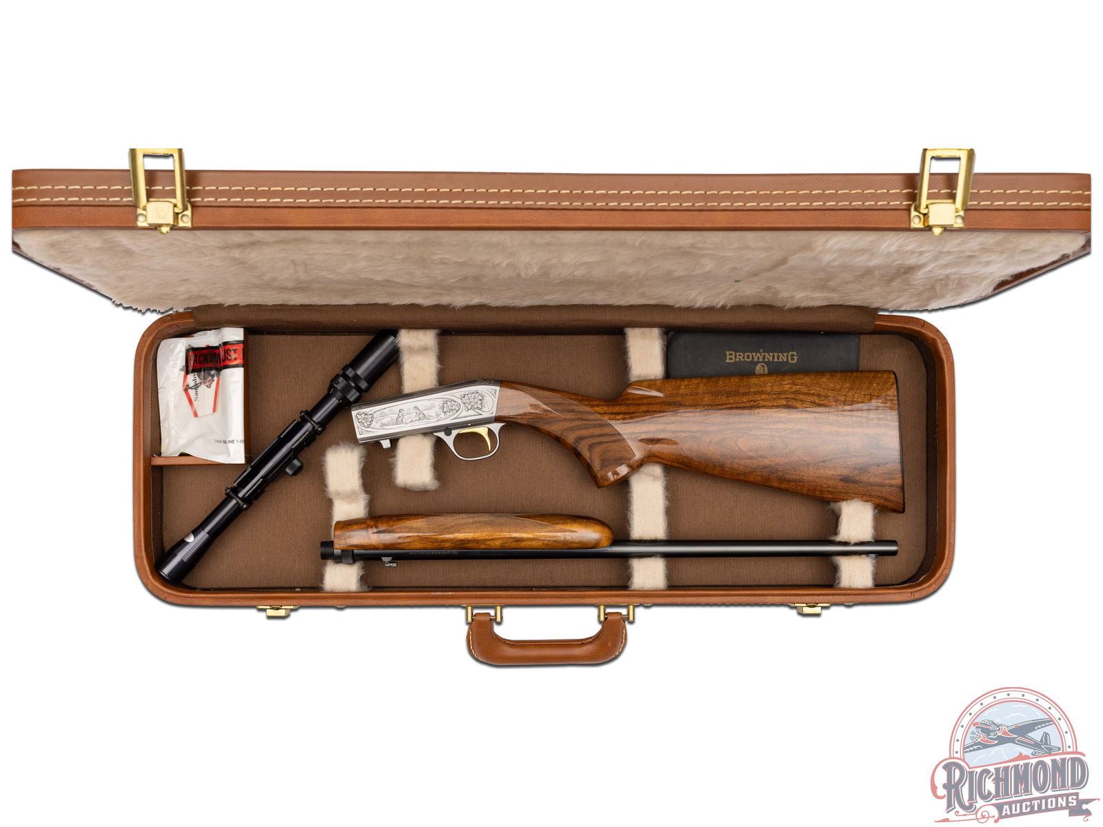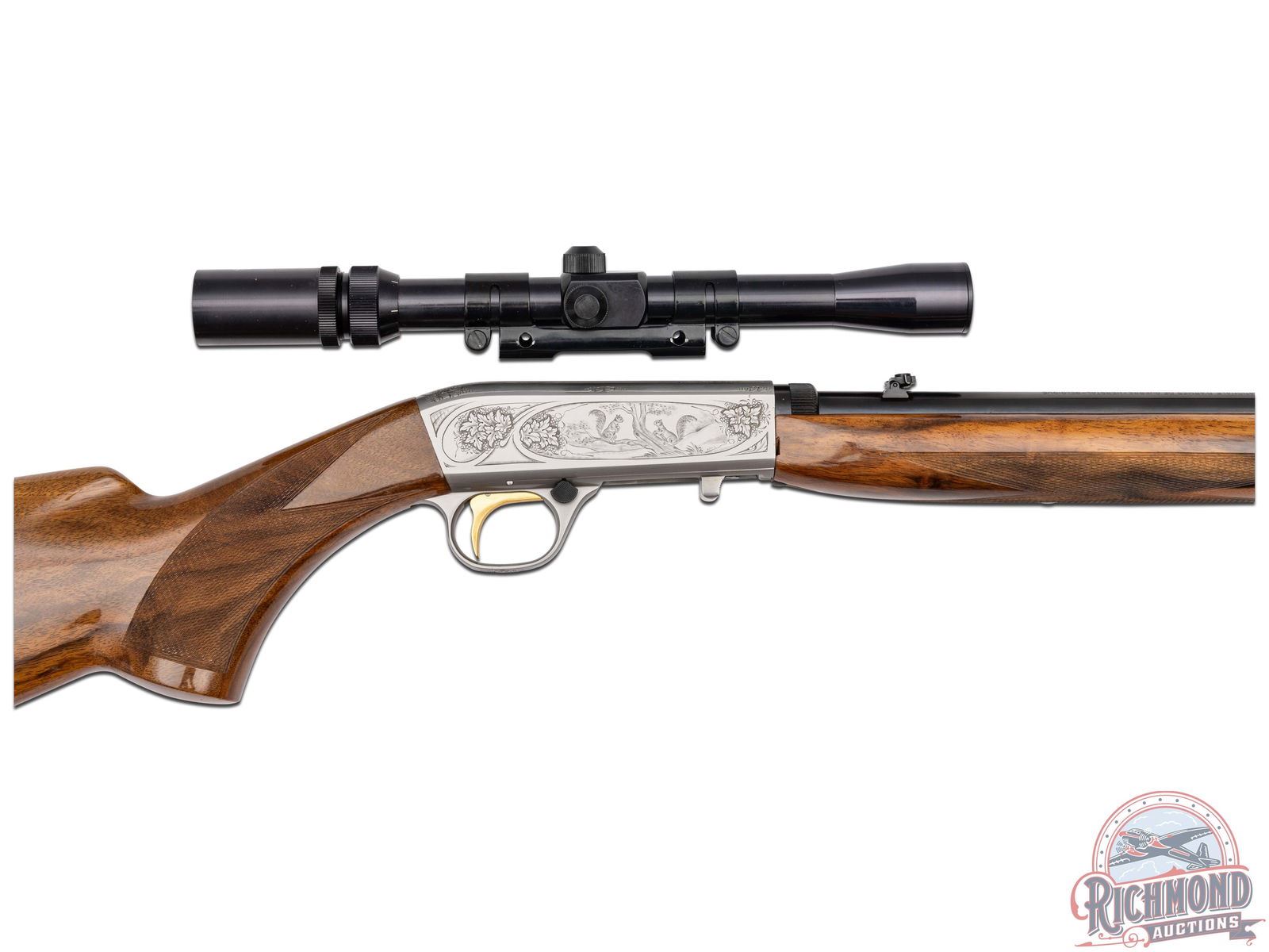 Manufactured in 1960 by FN in Belgium. Features a 19-1/4" blued round barrel stamped with single line FN address and "BROWNING PATENT DEPOSE". Flip-up rear notch adjustable sight and blade with brass bead front sight. Coin finished receiver features a RARE dovetail groove and Master Engraver Angelo Bee signed work. Left side features two groundhogs in a field in an oval border with grape leaf design and signed "A.BEE". Possible factory Grade II engraving with scarce full signature. Top of the receiver features factory done dovetail grooves with a grape leaf design border. Right side features two squirrels on a tree limb in an oval border with grape leaf design also signed "A.BEE". Bottom of the trigger guard engraved with the same grape leaf design. Gold washed trigger and crossbolt safety. Grade II walnut high gloss stock and forearm with hand-checkered pistol grip and base of forearm. Comes in the original factory take-down case with a Telstar Precision Optics 3X-7x20 scope. CALIBER: 22 LR. S/N: 72412. FFL STATUS: Curio & Relic.