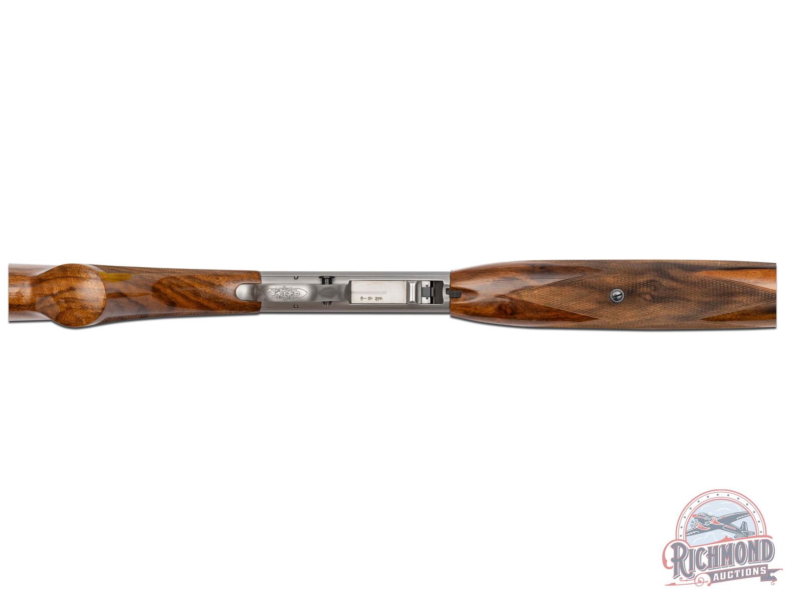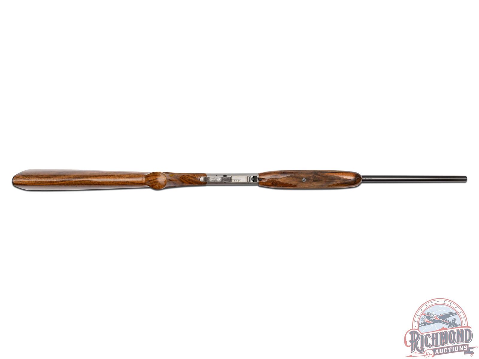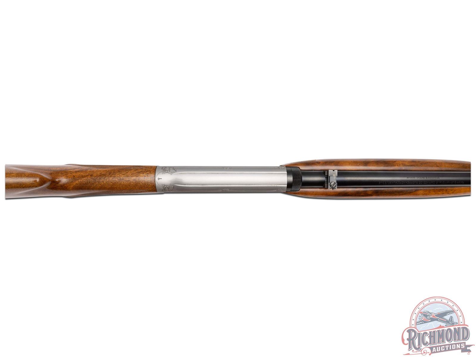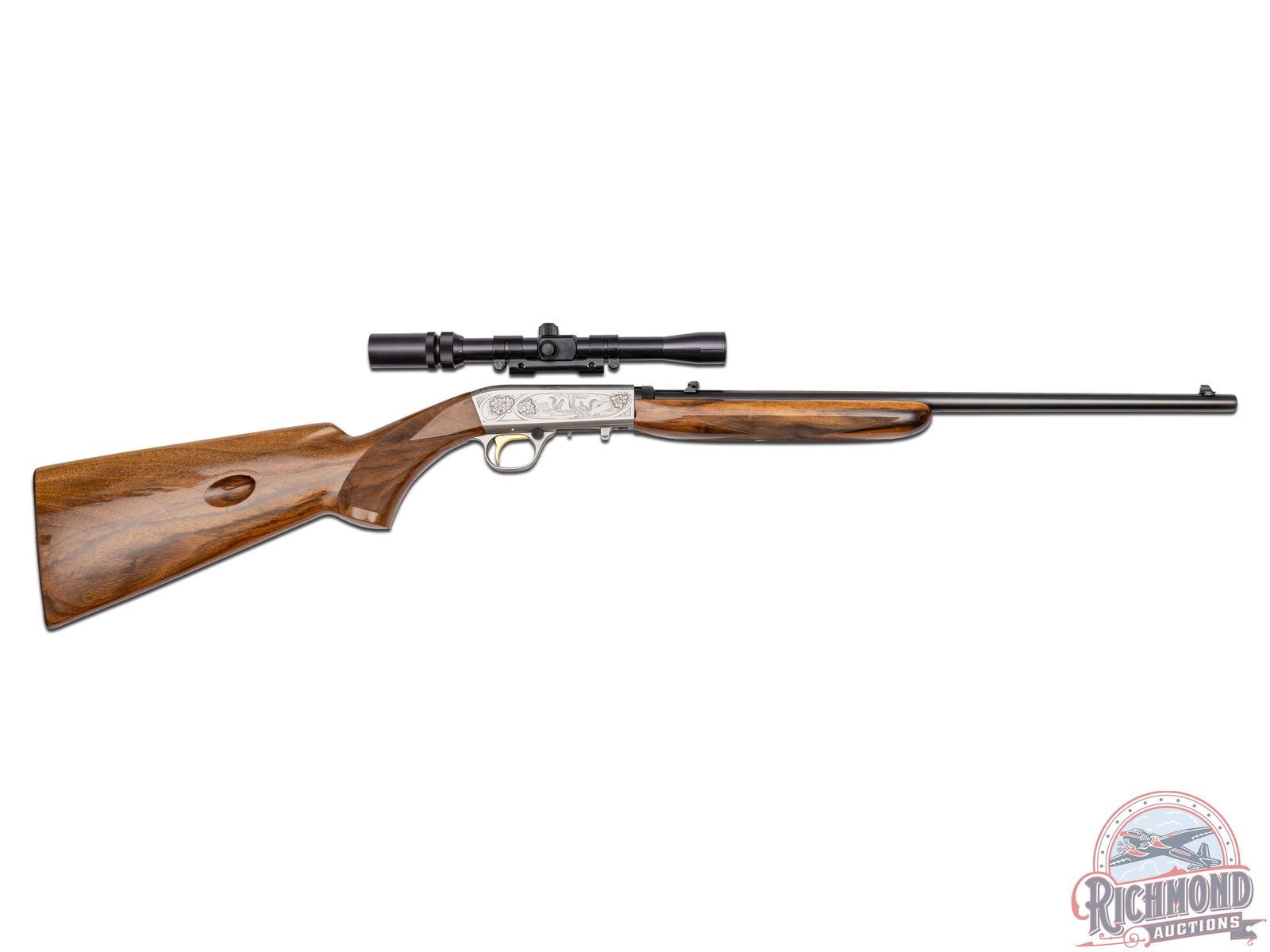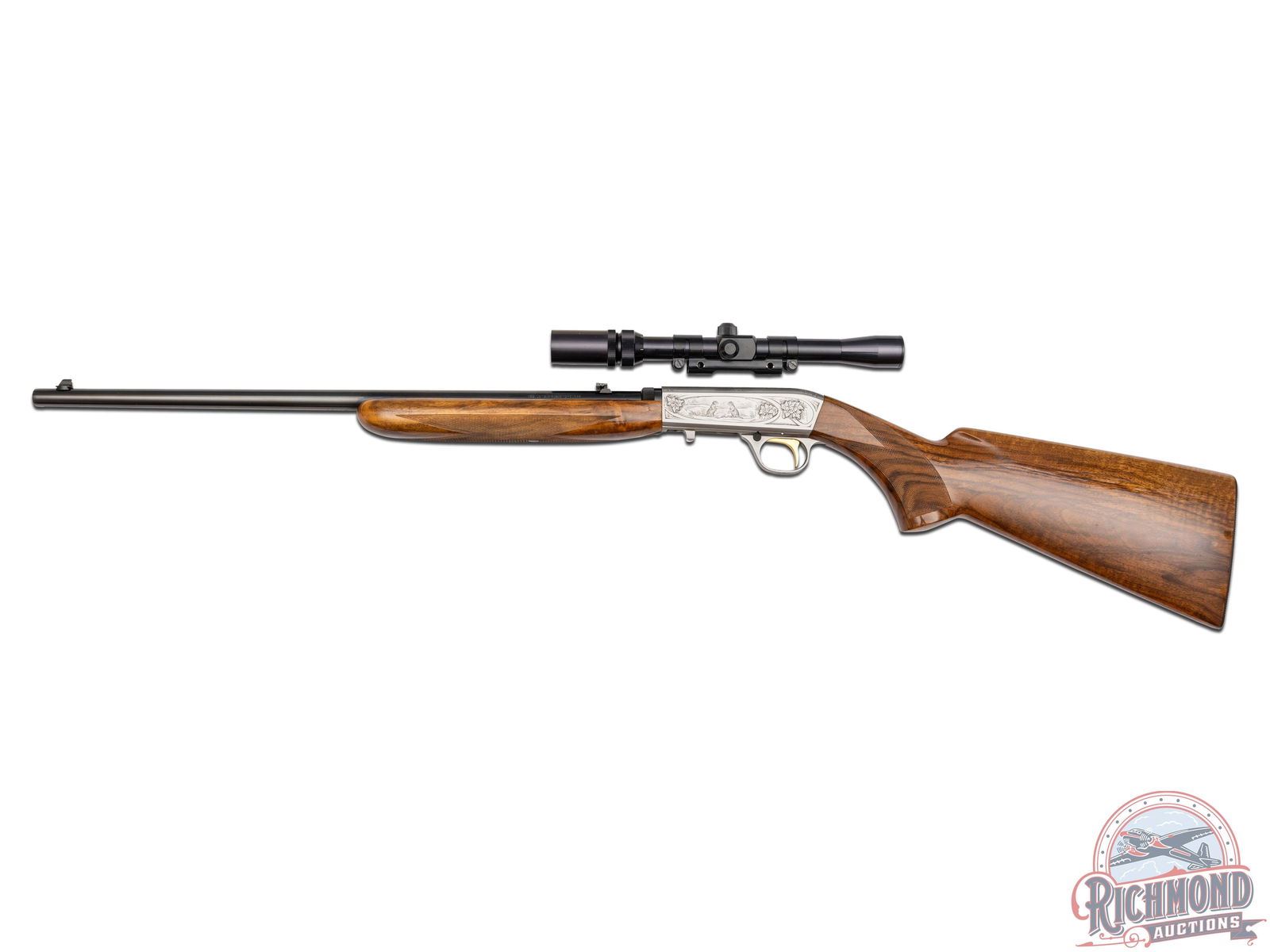 Manufactured in 1960 by FN in Belgium. Features a 19-1/4" blued round barrel stamped with single line FN address and "BROWNING PATENT DEPOSE". Flip-up rear notch adjustable sight and blade with brass bead front sight. Coin finished receiver features a RARE dovetail groove and Master Engraver Angelo Bee signed work. Left side features two groundhogs in a field in an oval border with grape leaf design and signed "A.BEE". Possible factory Grade II engraving with scarce full signature. Top of the receiver features factory done dovetail grooves with a grape leaf design border. Right side features two squirrels on a tree limb in an oval border with grape leaf design also signed "A.BEE". Bottom of the trigger guard engraved with the same grape leaf design. Gold washed trigger and crossbolt safety. Grade II walnut high gloss stock and forearm with hand-checkered pistol grip and base of forearm. Comes in the original factory take-down case with a Telstar Precision Optics 3X-7x20 scope. CALIBER: 22 LR. S/N: 72412. FFL STATUS: Curio & Relic.