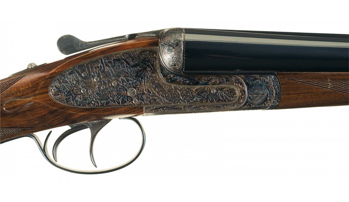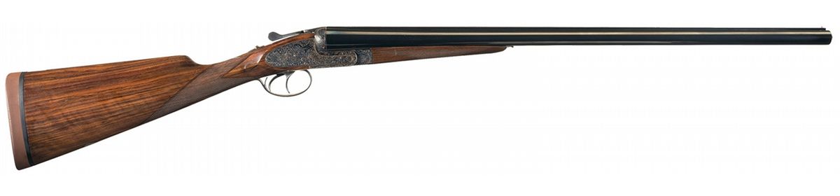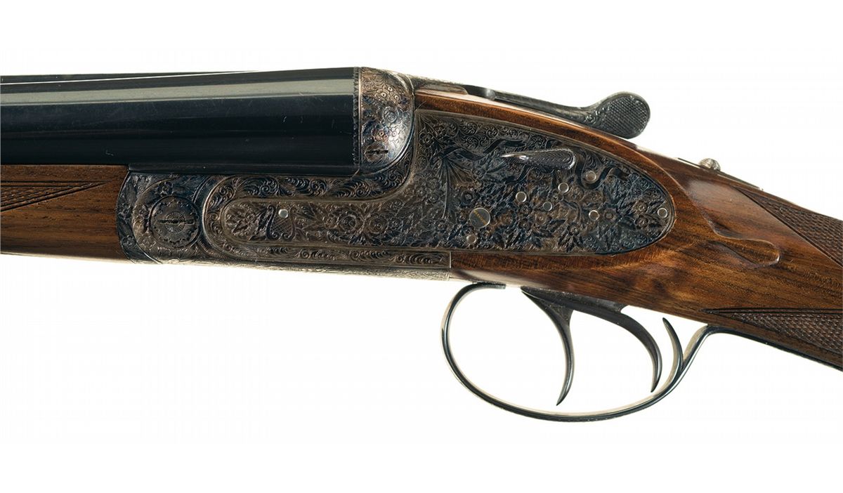 Manufactured in 1991 (date code "K2"). The receiver, side plates, break lever, trigger guard and forearm hardware have extensive floral scroll and rose bouquet designs. The barrels have a single steel bead sight, are choked .010/.025 and have 2 3/4 inch chambers. Fitted with a tang mounted safety and double triggers. Mounted on a multi-point checkered straight grain splinter walnut forearm and straight grip stock with a "DBT" engraved initial oval and a Pachmayr Decelerator recoil pad. Length of pull is 14 3/4 inches.