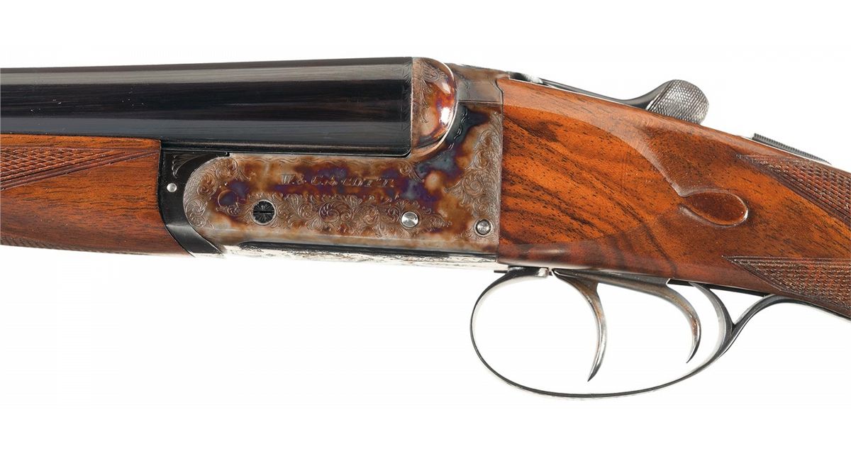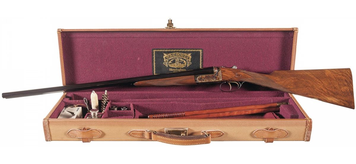 Manufactured circa 1978. There is floral scroll engraving on the receiver, trigger plate, trigger guard, break lever and forearm hardware. Has a single steel bead sight on the solid rib, is choked modified/full and has 2 3/4 inch chambers with ejectors. Mounted on a nicely figured multi-point checkered walnut forearm and straight grip stock with an initial oval and a checkered bare butt. Length of pull is 14 5/8 inches. With a canvas covered hardcase, snap caps, cleaning rod, bore brush, bore swab and a patch holder.