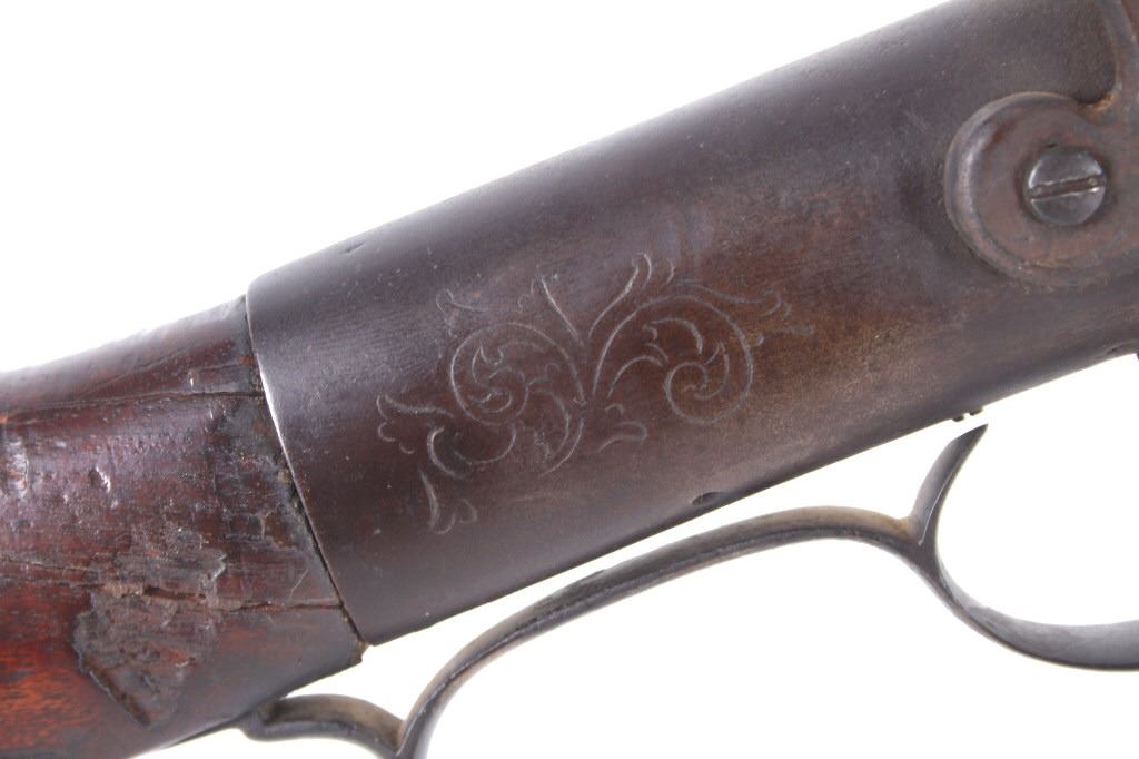 Featured in this lot we have an engraved Allen and Thurber side hammer percussion cap rifle chambered in .40 caliber. The rifle was manufactured by Allen and Thurber in the mid 1800's. The rifle displays a heavy 32" long octagonal barrel, walnut stock, engraved trigger guard and frame, metal foregrip and butt plate, and brown finish. The frame and hammer are engraved with vine and floral designs on both sides. The stock shows a dark paint or tar finish with the forgrip showing a warm brown finish. Mechanically the rifle shows a good working action with a heavy trigger and snappy hammer. The exterior shows a warm patina and some pitting and wear across the barrel. No Serial Number. This firearm qualifies as an Antique, and does not require FFL Transfer or NICS Background Check.