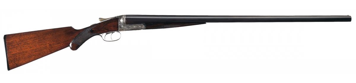 Manufactured in 1919. Single steel bead sight, choked modified/modified, 2 3/4 inch chambers with lengthened forcing cones and extractors. The bottom flat of the barrel is marked "SECOND", "Fox" proof and serial number. The receiver, break lever and trigger guard are engraved with floral scroll and geometric patterns. Mounted on a multi-point checkered walnut forearm and round knob pistol grip stock with serrated plastic buttplate. Length of pull is 13 3/8 inches.