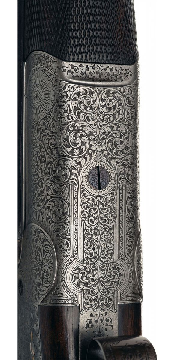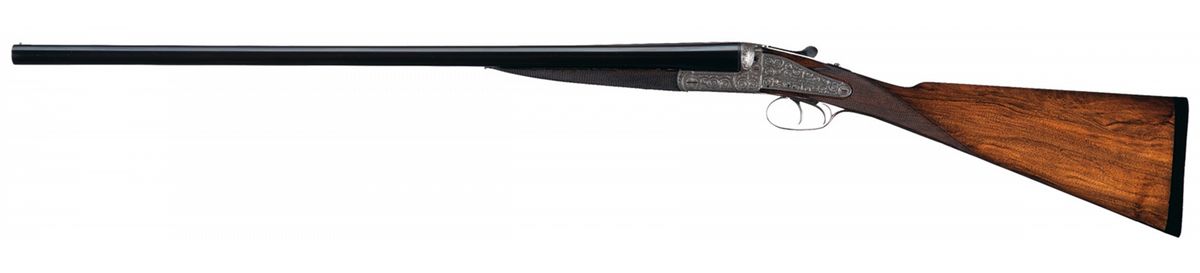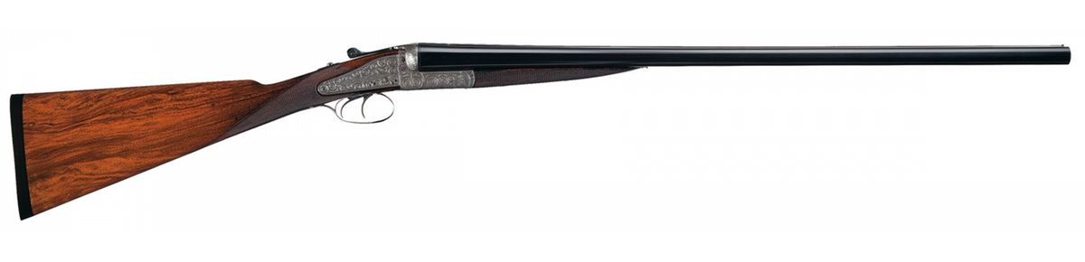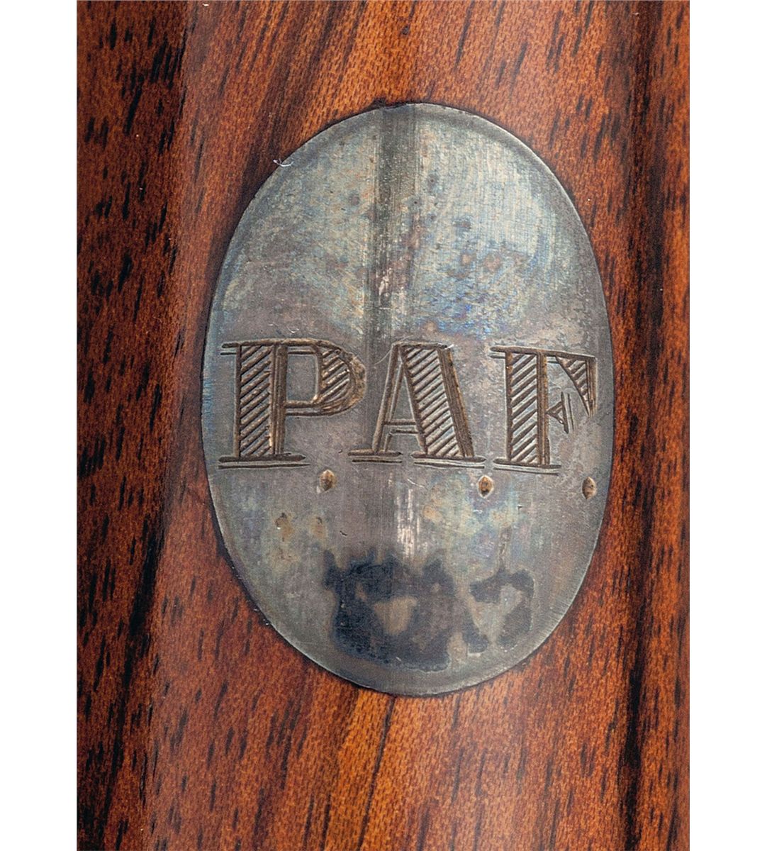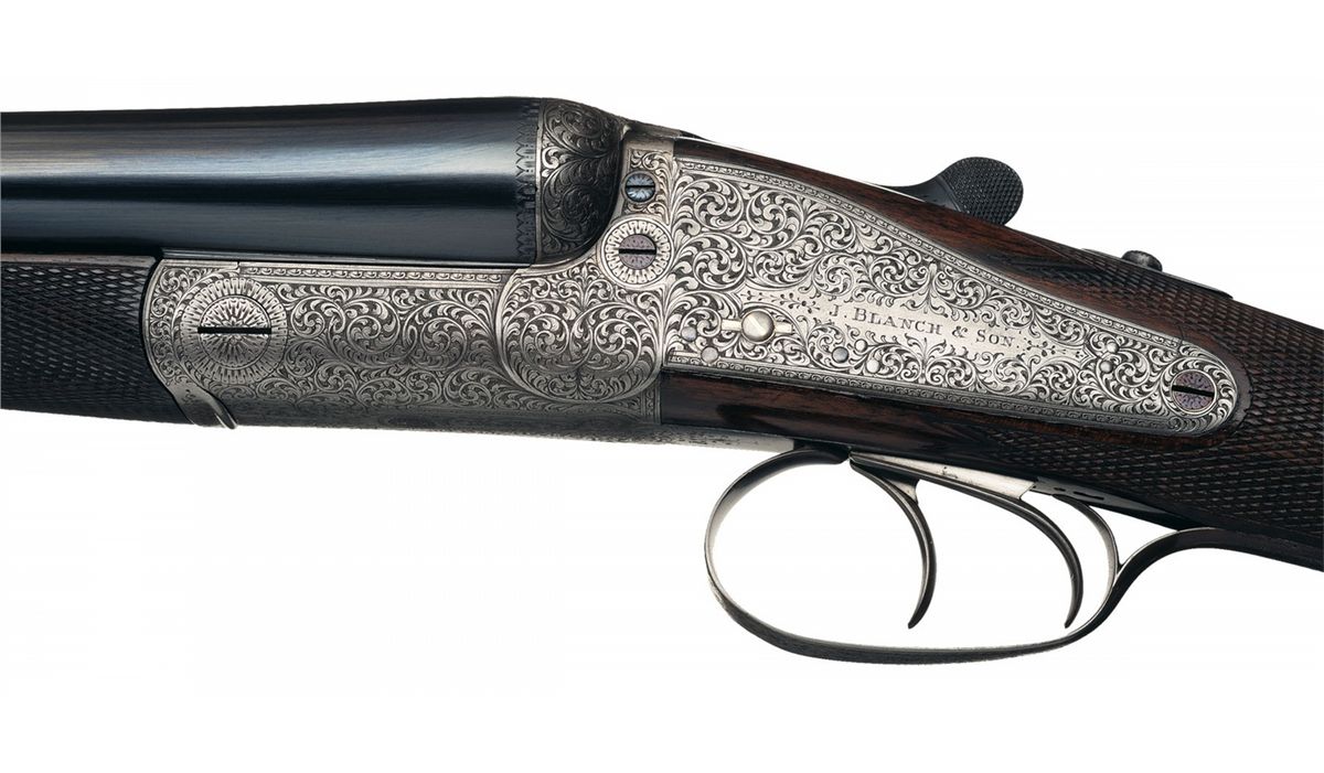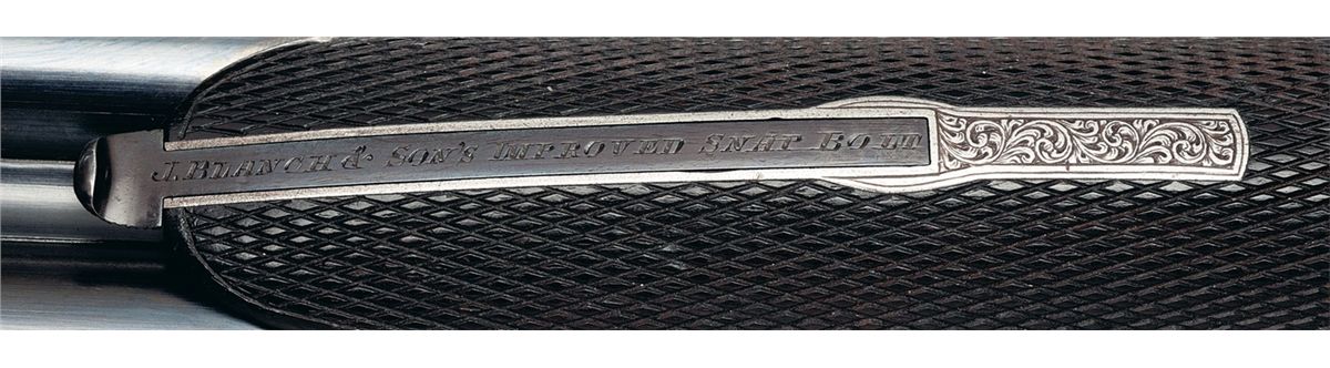 Manufactured circa 1890, there is 100% bold foliate scroll engraving on the receiver, break lever and trigger guard/lower tang with "J. BLANCH & SON" on each side. The water table is marked with "crown/BV", "crown/V" and "crown/cp" proof marks. The barrels have a single steel bead sight, choked improved cylinder/improved modified and 2 3/4 inch chambers with ejectors. The solid rib is marked "J. BLANCH & SON 28 GRACECHURCH STREET LONDON" with the bottom flat marked with a "12", (732"), a London nitro proof, "12" in a diamond, "2 3/4" and "3 1/4 TONS". Mounted on a full coverage checkered splinter forearm with forearm release lever marked "J. BLANCH & SON'S IMPROVED SNAP BOLT" and straight grip stock with silver initial inlay marked "P.A.F." and a checkered horn buttplate. Length of pull is 14 inches.