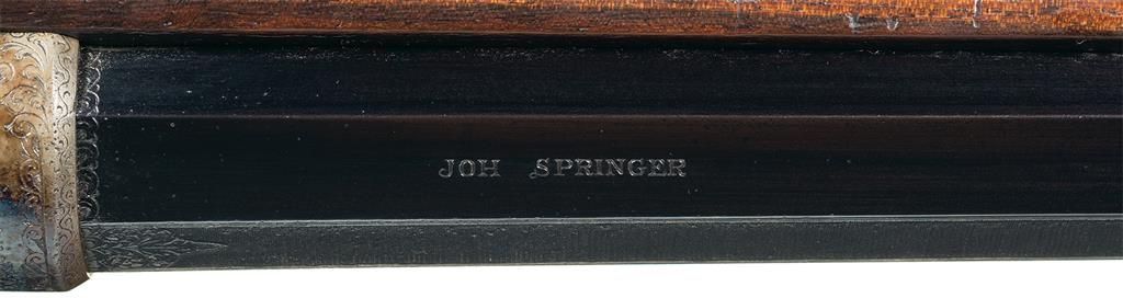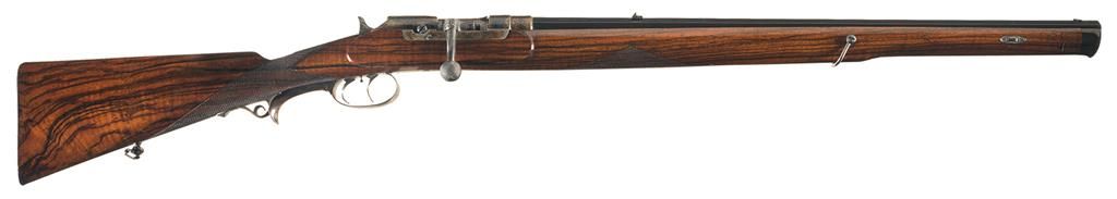 The rifle was manufactured by Johann Springer of Vienna, Austria, for Kaiser Wilhelm II whose royal monogram adorns the top of the receiver. Wilhelm II came into power in 1888, and would be the last German Emperor and King of Prussia, abdicating the throne and going into exile at the close of the First World War. In early November 1918, a few days prior to Germany's defeat in a conflict that many blamed him for transforming into a world war, Wilhelm II sought asylum in the Netherlands where he died in 1941 after living a life as a country gentleman. The receiver features an extensive fine floral scroll engraved pattern with a deep relief carved royal monogram of Kaiser Wilhelm II (crown over "W") on the top. The barrel is fitted with a blade front sight and a two leaf rear sight (one folding, one fixed) on the matte top flat. The rear of the upper left barrel flat is marked "JOH SPRINGER" and the upper right barrel flat at the rear is marked "ERBEN IN WIEN." Founded in 1836, Johann Springer continues to be a leading Austrian retailer of hunting and sporting rifles and supplies and manufacturer of custom rifles on a limited basis under the name Johann Springer's Erben, which has brought together two of Austria's oldest and most respected gun markers, Johann Springer and Franz Sodia. The rifle is equipped with double set triggers. The bolt knob is checkered and the bolt handle is engraved. The left side of the bolt assembly is marked with the number "1120". The rifle has a blue barrel with the remaining surfaces casehardened. The highly figured, full length walnut stock features checkering on the forearm and wrist, a cheekpiece, an engraved single barrel wedge, horn forend cap and trigger guard extension and sling swivels. The flat metal buttplate is stamped "No. 6453" along with the number "24" on the tang.