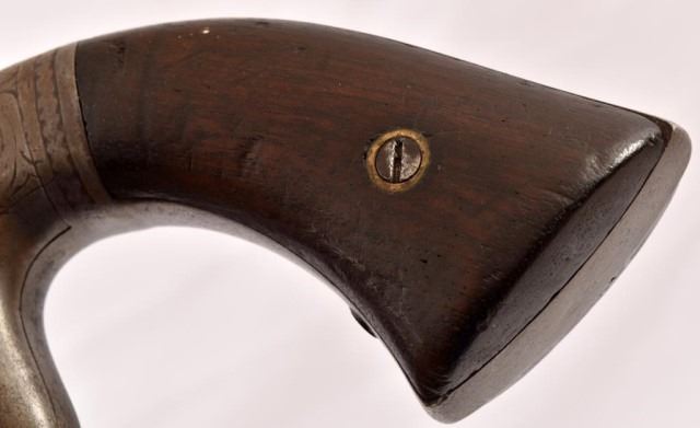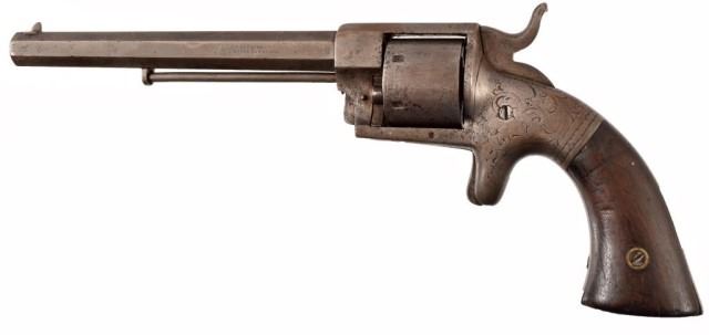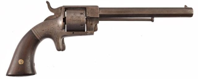 Engraved Bacon .38 rimfire Hopkins patent Navy revolver. 7.5" octagon barrel. Serial #139